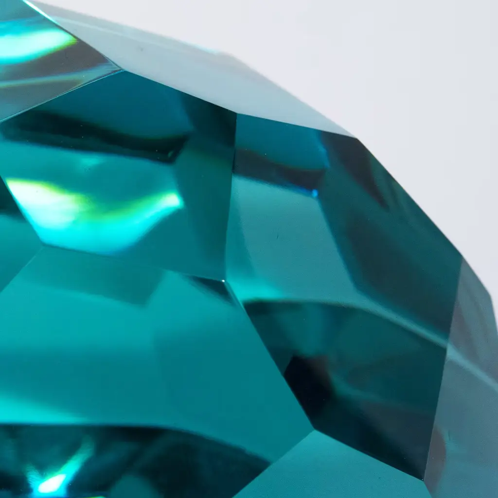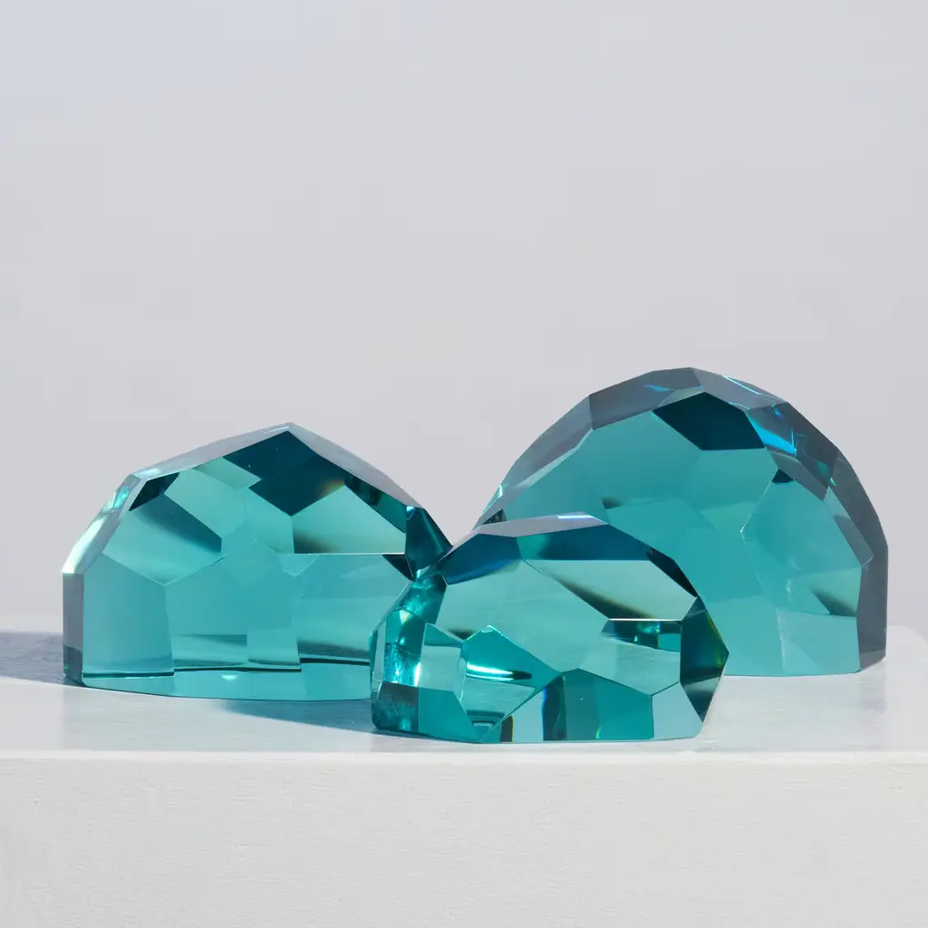 These sculptures are exclusive and unique as they have been entirely hand-worked from blocks of crystal. This makes it impossible to create other identical. The crystal blocks have undergone all the processes to be so harmonious in shape. The facets of the crystal are similar to those of a precious jewel. The natural color of the crystals is aquamarine-like. Every piece is unique, due to handcrafting, slight changes may occur. Please, contact the Concierge for further information.