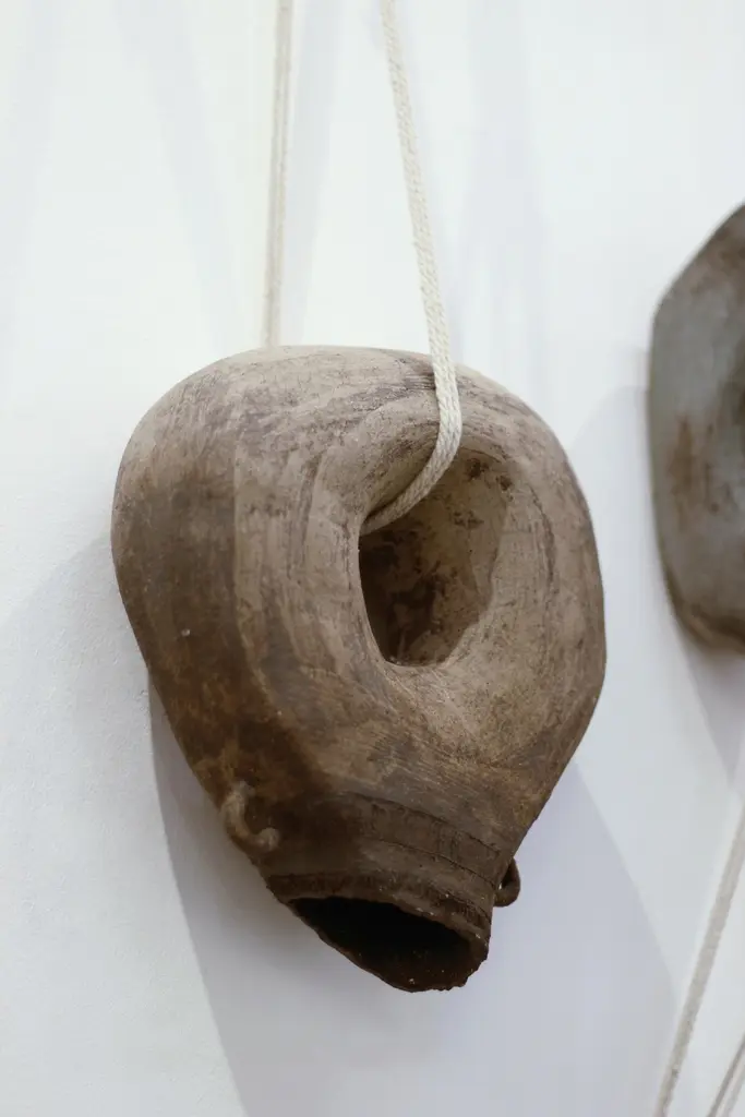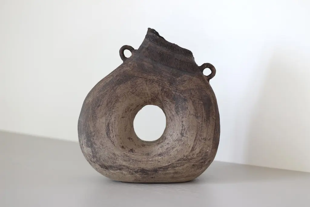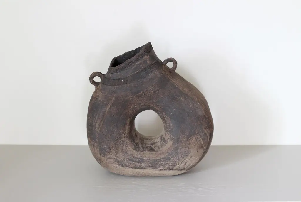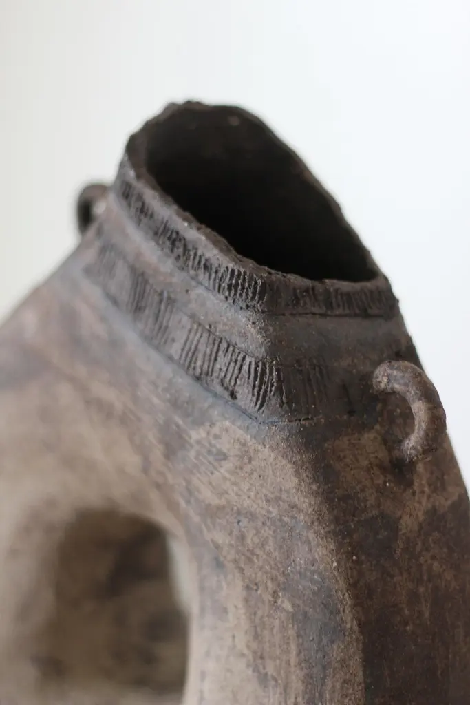 Generation 03 by Eguzkiñe EgañaUniqueDimensions: W 25 x L 10 x H 27 cmMaterials: Black stoneware, slip and ropeIn this series of pieces, called 13 generations, Eguzkiñe connects with an imaginary world from his previous thirteen generations, where he speculates on those past lives, imagining them as lives dedicated to the artisanal creation of everyday objects. With the clear intention of recovering our roots and especially the value of craftsmanship, the artist enters it understanding it as a slow and thoughtful process, in which a job well done and conscientiously prevails. The rope is used as a binding link. Unique piece.Eguzkiñe Egaña Corta studied advertising and for more than 20 years has worked as a graphic designer. About 12 years ago, surrounded by a completely digital world, she felt the need to create with her hands and it is from there that she took up her drawings and illustrations and began to create with ceramics. She has completed a Master’s degree at the University of the Basque Country: “Ceramics; art and function” and combi - nes her work as a designer and illustra - tor with contemporary artistic creation. She also teaches ceramics classes at the municipal school of Zarautz, a city in the Basque Country where she lives. She feels the need to explore the re - lationship between identity and self-knowledge. Work with the concepts; interior, exterior, return, connect, ancestral and artisanal, establishing a relationship between us and our environment, as well as between us and our ancestors, either emotionally, empathetically or through objects that somehow transport us to a hypothetical place in the past, both for its aesthetics and for the ways in which they have been created. Human beings are containers of desires, fears, expectations. Sometimes it is ne - cessary to empty ourselves of everything that clutters the mind. On many occa - sions the artist works with turned contai - ners reflecting this analogy. The rope is an element that she is interested in using in these sculptures, due to its conceptual charge. Unite, tie, join, analogies that the artist compares with the force of love that transcends life and death and that unites the past, the present and the future.