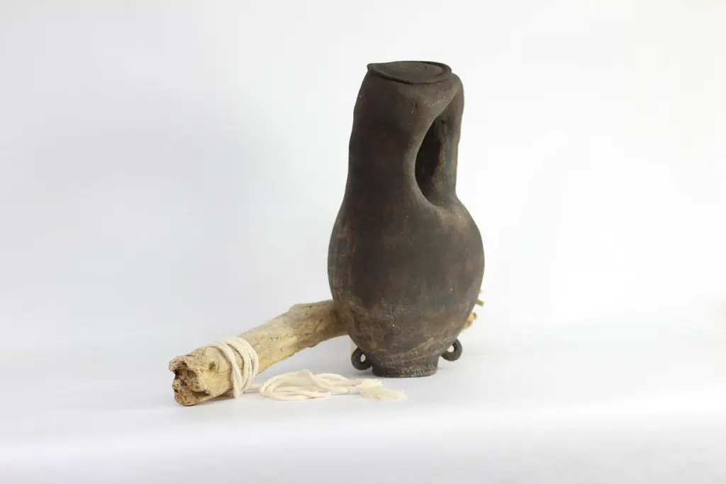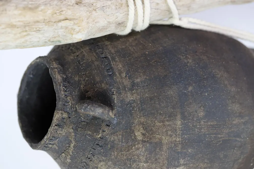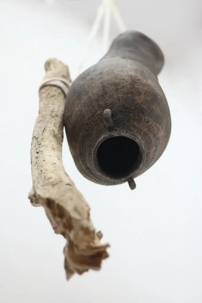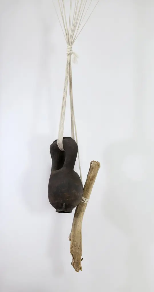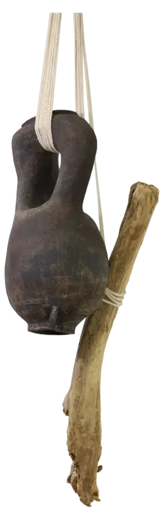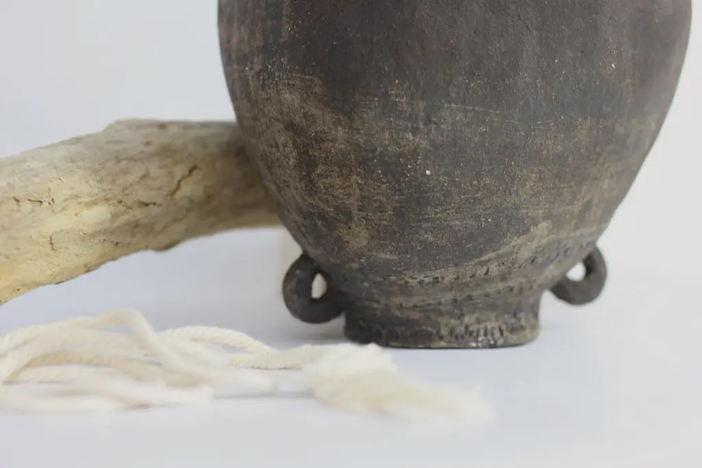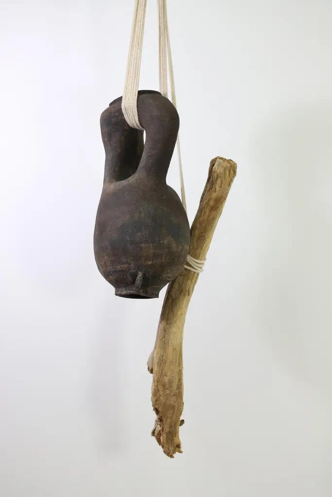 Generation 05 by Eguzkiñe EgañaUniqueDimensions: W 20.5 x L 20 x H 40 cmMaterials: black stoneware, slip, rope and wooden logIn this series of pieces, called 13 generations, Eguzkiñe connects with an imaginary world from his previous thirteen generations, where he speculates on those past lives, imagining them as lives dedicated to the artisanal creation of everyday objects. With the clear intention of recovering our roots and especially the value of craftsmanship, the artist enters it understanding it as a slow and thoughtful process, in which a job well done and conscientiously prevails. The rope is used as a binding link. Unique piece.Eguzkiñe Egaña Corta studied advertising and for more than 20 years has worked as a graphic designer. About 12 years ago, surrounded by a completely digital world, she felt the need to create with her hands and it is from there that she took up her drawings and illustrations and began to create with ceramics. She has completed a Master’s degree at the University of the Basque Country: “Ceramics; art and function” and combi - nes her work as a designer and illustra - tor with contemporary artistic creation. She also teaches ceramics classes at the municipal school of Zarautz, a city in the Basque Country where she lives. She feels the need to explore the re - lationship between identity and self-knowledge. Work with the concepts; interior, exterior, return, connect, ancestral and artisanal, establishing a relationship between us and our environment, as well as between us and our ancestors, either emotionally, empathetically or through objects that somehow transport us to a hypothetical place in the past, both for its aesthetics and for the ways in which they have been created. Human beings are containers of desires, fears, expectations. Sometimes it is ne - cessary to empty ourselves of everything that clutters the mind. On many occa - sions the artist works with turned contai - ners reflecting this analogy. The rope is an element that she is interested in using in these sculptures, due to its conceptual charge. Unite, tie, join, analogies that the artist compares with the force of love that transcends life and death and that unites the past, the present and the future.