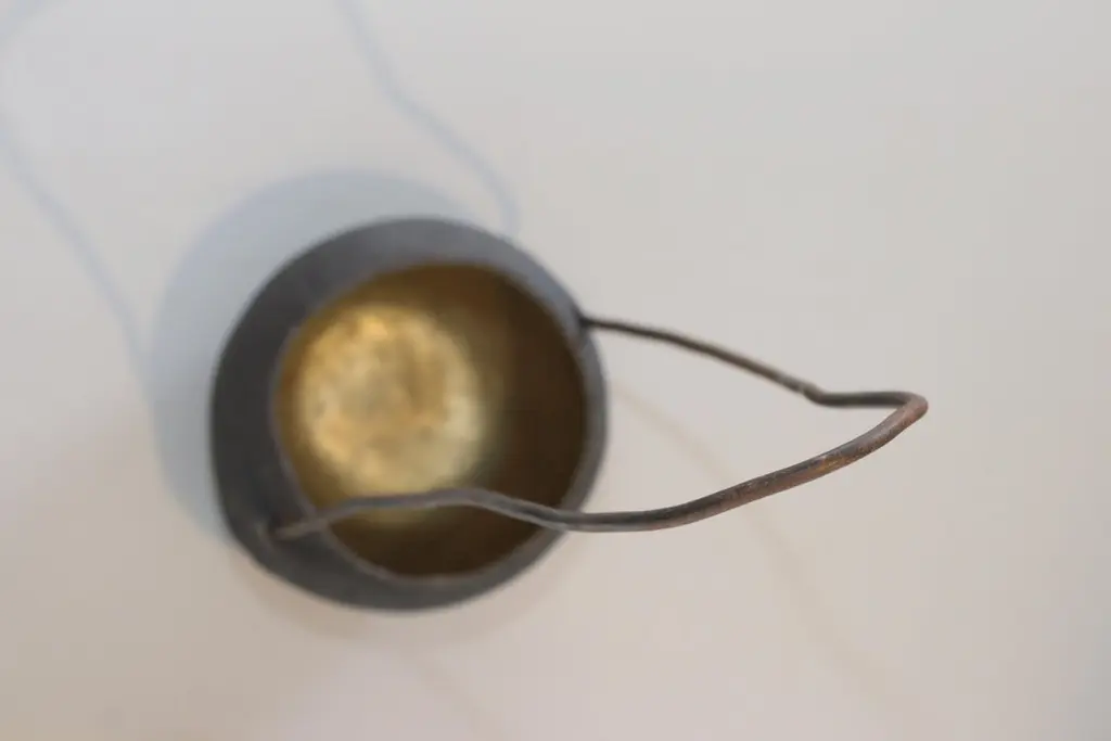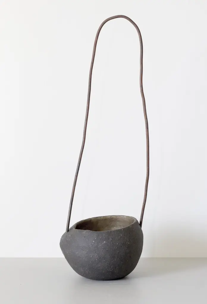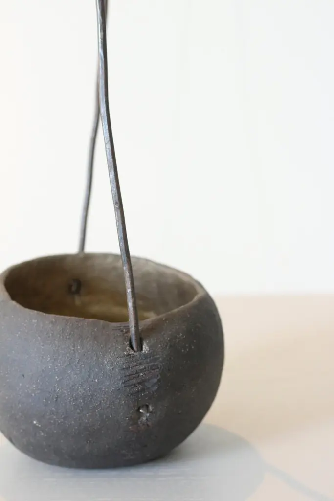 Generation 07 by Eguzkiñe EgañaUniqueDimensions: W 19.5 x L 16 x H 12/53 with iron cmMaterials: Black stoneware and Iron.The golden effect is achieved by applying antique wax and rubbing with a brass brush. In this series of pieces, called 13 generations, Eguzkiñe connects with an imaginary world from his previous thirteen generations, where he speculates on those past lives, imagining them as lives dedicated to the artisanal creation of everyday objects. With the clear intention of recovering our roots and especially the value of craftsmanship, the artist enters it understanding it as a slow and thoughtful process, in which a job well done and conscientiously prevails. The rope is used as a binding link. Unique piece.Eguzkiñe Egaña Corta studied advertising and for more than 20 years has worked as a graphic designer. About 12 years ago, surrounded by a completely digital world, she felt the need to create with her hands and it is from there that she took up her drawings and illustrations and began to create with ceramics. She has completed a Master’s degree at the University of the Basque Country: “Ceramics; art and function” and combi - nes her work as a designer and illustra - tor with contemporary artistic creation. She also teaches ceramics classes at the municipal school of Zarautz, a city in the Basque Country where she lives. She feels the need to explore the re - lationship between identity and self-knowledge. Work with the concepts; interior, exterior, return, connect, ancestral and artisanal, establishing a relationship between us and our environment, as well as between us and our ancestors, either emotionally, empathetically or through objects that somehow transport us to a hypothetical place in the past, both for its aesthetics and for the ways in which they have been created. Human beings are containers of desires, fears, expectations. Sometimes it is ne - cessary to empty ourselves of everything that clutters the mind. On many occa - sions the artist works with turned contai - ners reflecting this analogy. The rope is an element that she is interested in using in these sculptures, due to its conceptual charge. Unite, tie, join, analogies that the artist compares with the force of love that transcends life and death and that unites the past, the present and the future.