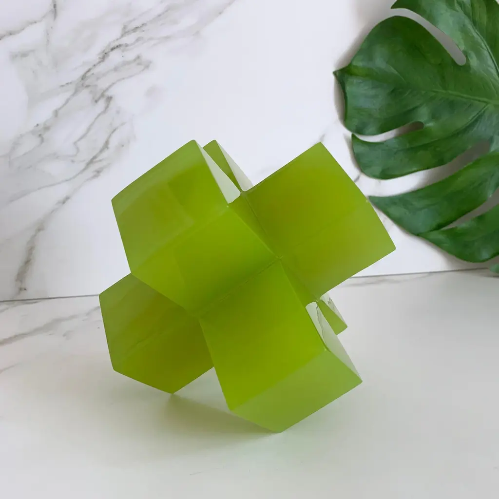 Geometric sculpture made in polished resin in variety of colors. It is a modern and colorful piece that will liven up any space.This sculpture is very versatile and fun! You can create a different sculpture just by stacking up to three pieces.We also love it styled on a stack of coffee table books.Designed by Paola Valle and manufactured in Mexico City by extraordinary artisans. Our goal is to work hand by hand to create outstanding pieces that will represent our passion.Please avoid placing your resin pieces in direct sunlight to avoid discoloration. All resin items are strong and durable but should be treated with care as they can break if dropped or knocked against a hard surface. Colors may vary slightly to the item shown in previous photos, as everything is handmade.