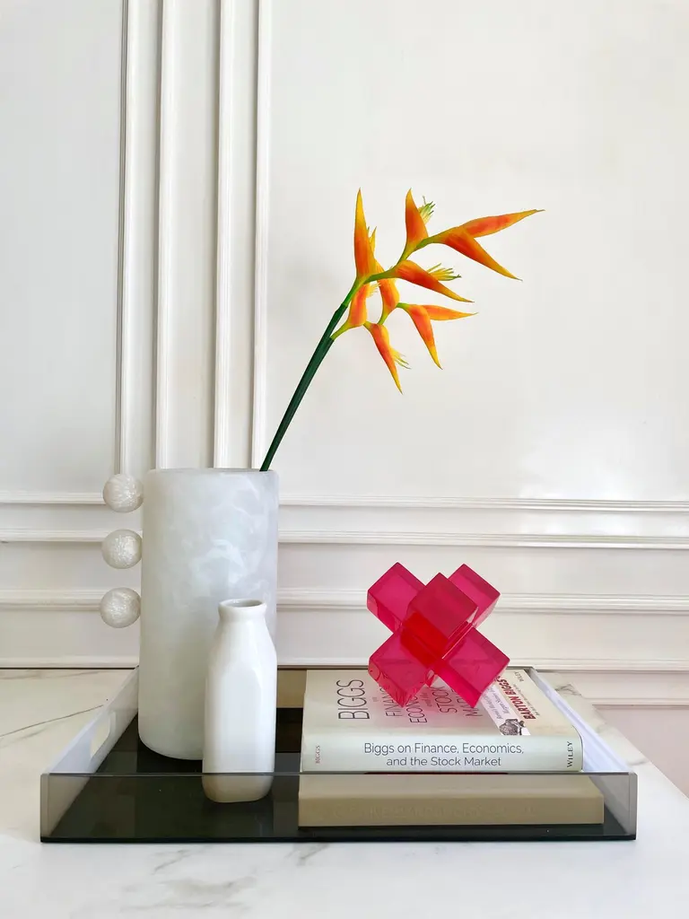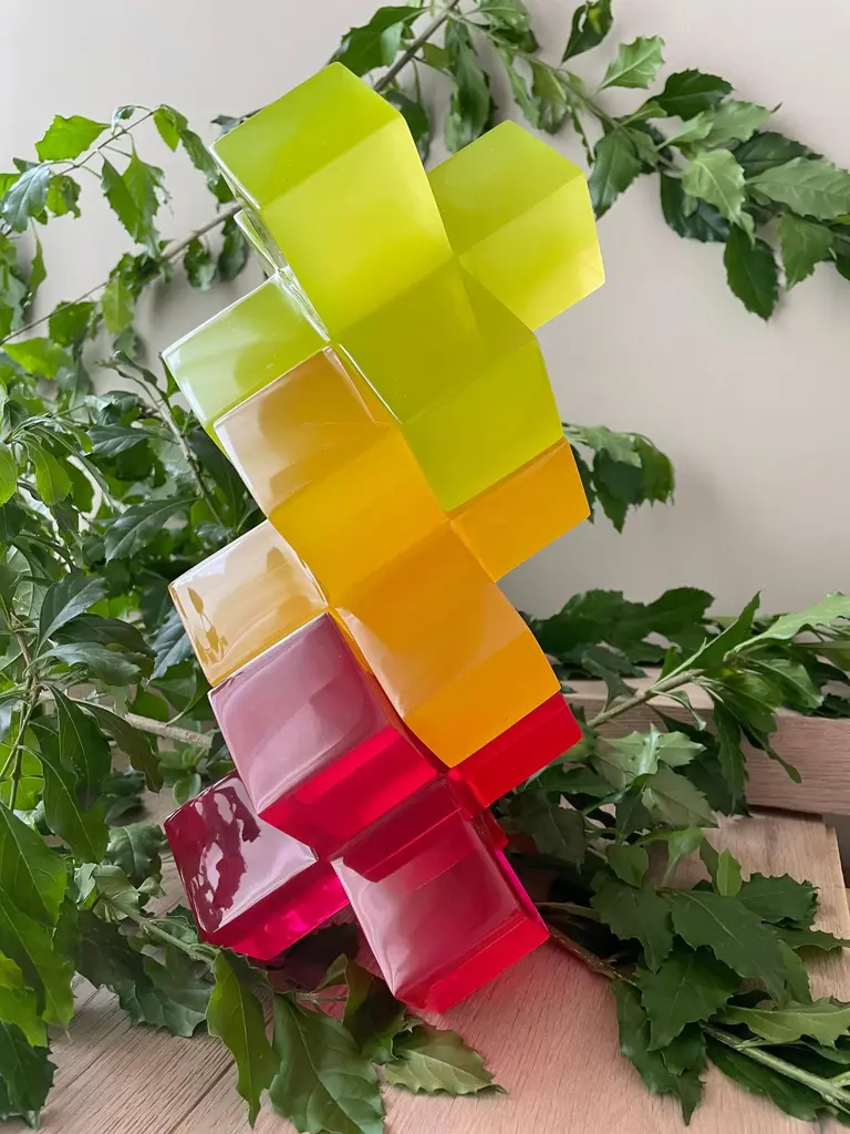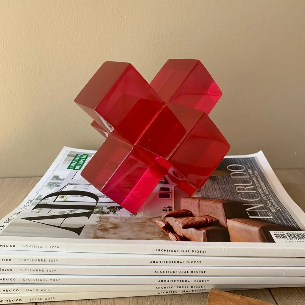 Geometric sculpture made in polished resin in variety of colors. It is a modern and colorful piece that will liven up any space.This sculpture is very versatile and fun! You can create a different sculpture just by stacking up to three pieces.We also love it styled on a stack of coffee table books.Designed by Paola Valle and manufactured in Mexico City by extraordinary artisans. Our goal is to work hand by hand to create outstanding pieces that will represent our passion.Please avoid placing your resin pieces in direct sunlight to avoid discoloration. All resin items are strong and durable but should be treated with care as they can break if dropped or knocked against a hard surface. Colors may vary slightly to the item shown in previous photos, as everything is handmade.