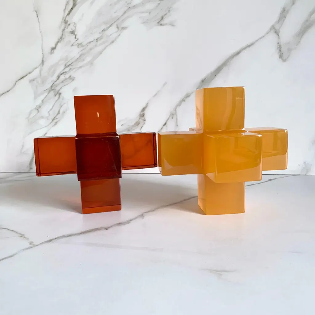 Geometric sculpture made in polished resin in variety of colors. It is a modern and colorful piece that will liven up any space.This sculpture is very versatile and fun! You can create a different sculpture just by stacking up to three pieces.We also love it styled on a stack of coffee table books.Designed by Paola Valle and manufactured in Mexico City by extraordinary artisans. Our goal is to work hand by hand to create outstanding pieces that will represent our passion.Please avoid placing your resin pieces in direct sunlight to avoid discoloration. All resin items are strong and durable but should be treated with care as they can break if dropped or knocked against a hard surface. Colors may vary slightly to the item shown in previous photos, as everything is handmade.