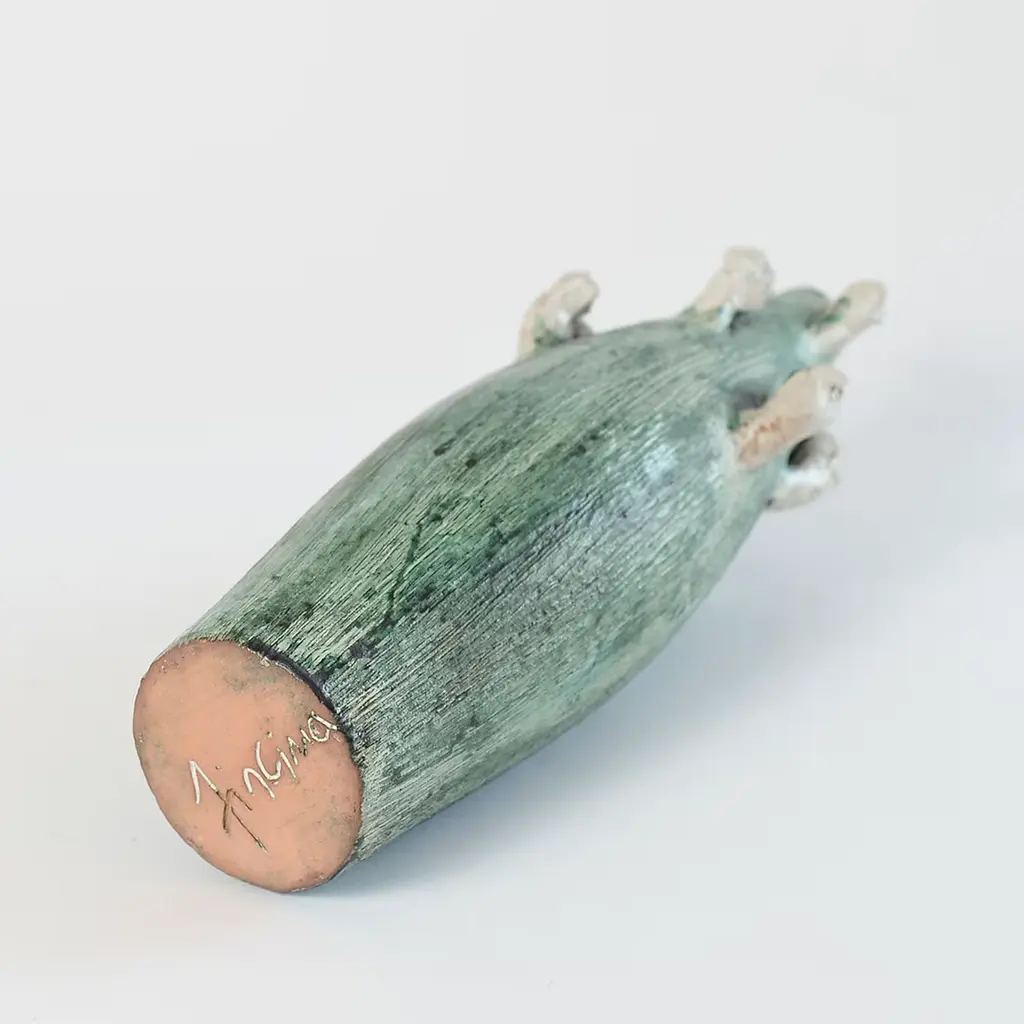 This unique sculpture made by hand in terracotta using the coiling technique, was then covered with rich glazes and oxides, to resemble a blooming plant. Due to its hand-crafted nature, reproductions of this piece will be similar but not identical.