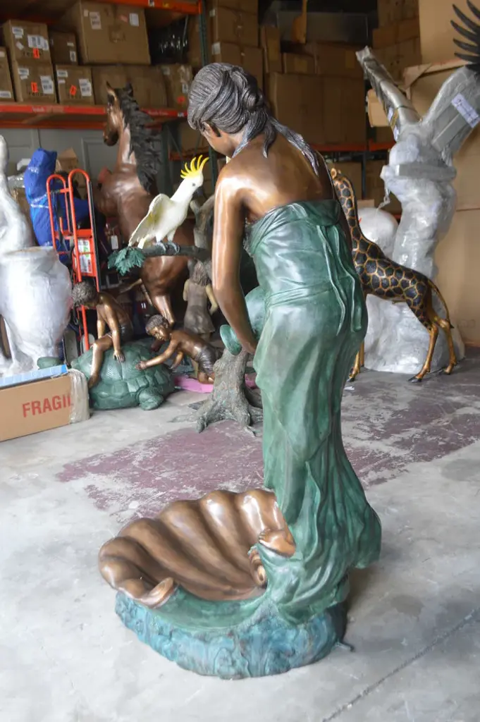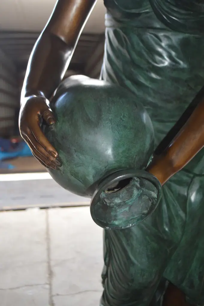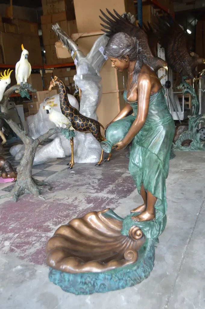 Sculpted beautiful fountain of a topless girl holding a pot standing on a large bronze Sculpture. Water spills out from the pot with the use of a fountain pump (pump not included). This sculpture is a finely crafted, highly detailed work of art. You will be very pleased with the quality of this amazing female sculpture. This bronze sculpture was cast using the lost Wax Method. This impressive Bronze Statue will be a permanent fixture on the grounds of your estate for years to come. Size: 33"L x 30"W x 62"H. Weight is: 160Lb