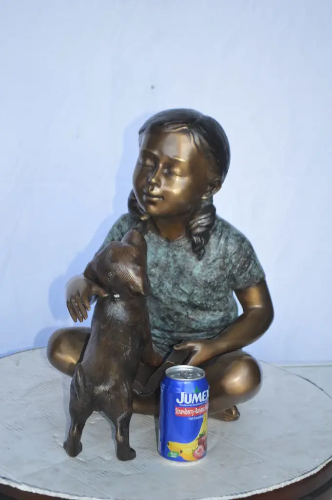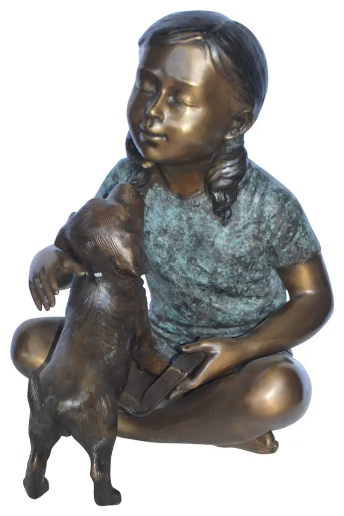 Girl Petting Her Dog While Reading Bronze Statue - Size: 13"l X 18"w X 18"h.
