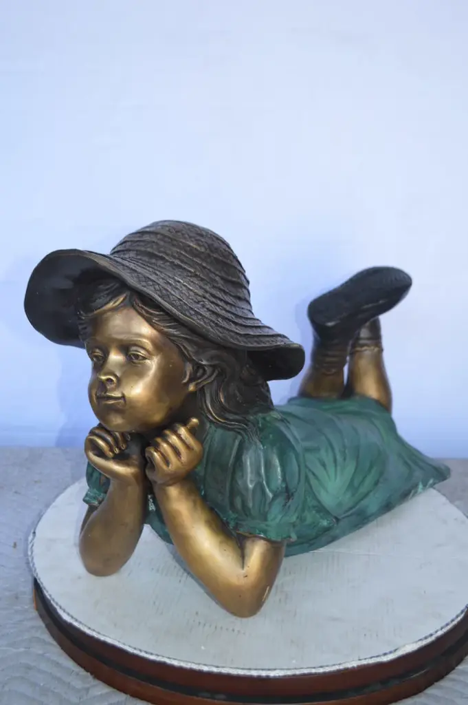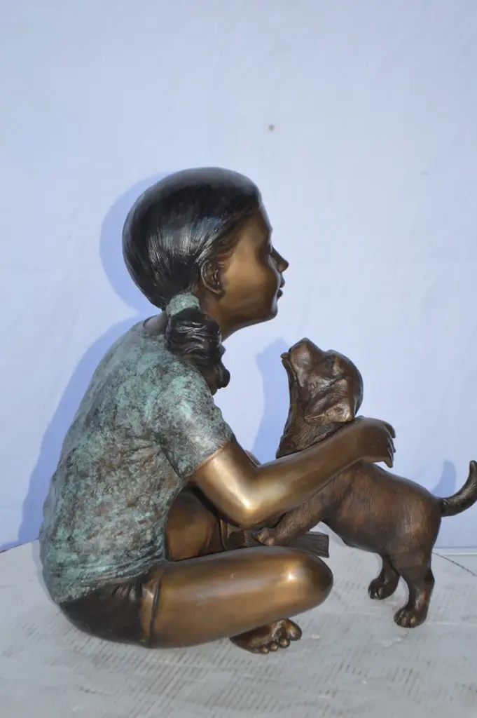 This delightfully amusing bronze Sculpture of a Girl Petting her Dog While Reading a book. The joy of youth, lost in a book and putting thoughts to paper, will make your landscape come alive. This is a beautiful bronze statue stained in green and brown patina with clear finish for preservation. This bronze statue is museum quality and hand-cast in high-quality pure bronze using the Lost Wax Process of bronze casting. Size: 13"L x 18"W x 18"H. Weight is: 25Lb