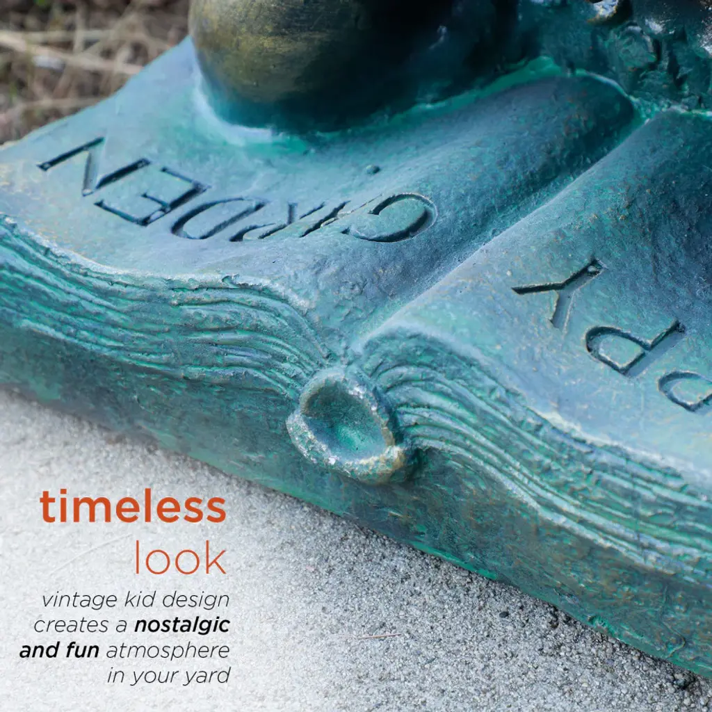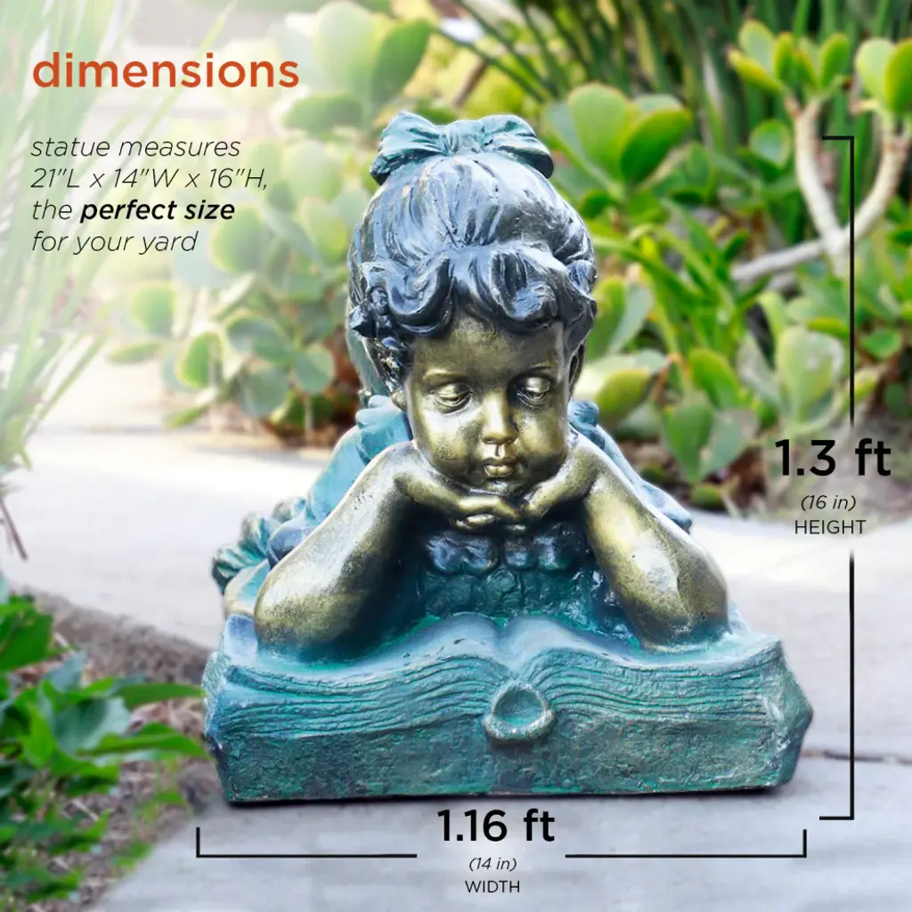 The antique finish on this Girl Reading Book Statue has a timeless charm that captures the innocence of childhood. The intricate detailing of this child is sure to bring a whimsical playfulness to your garden or deck.