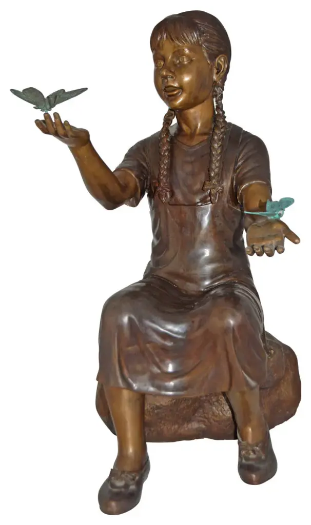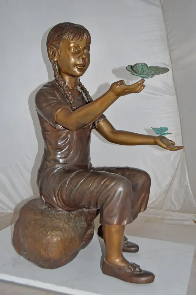 This is a large size bronze statue of a girl sitting on a rock. This statue characterized by the youthfulness of the girl as she looks at the butterflies playing around her. The statue is a scene well captured in a museum quality, hand-cast bronze using the Lost Wax Process of bronze casting. The statue can be put over a water creek or on the ground, outdoors or indoors. This is a gorgeous scene straight of a novel and is a perfect bronze statue for anybody. Size: 26"L x 17"W x 34"H. Weight is: 53Lb