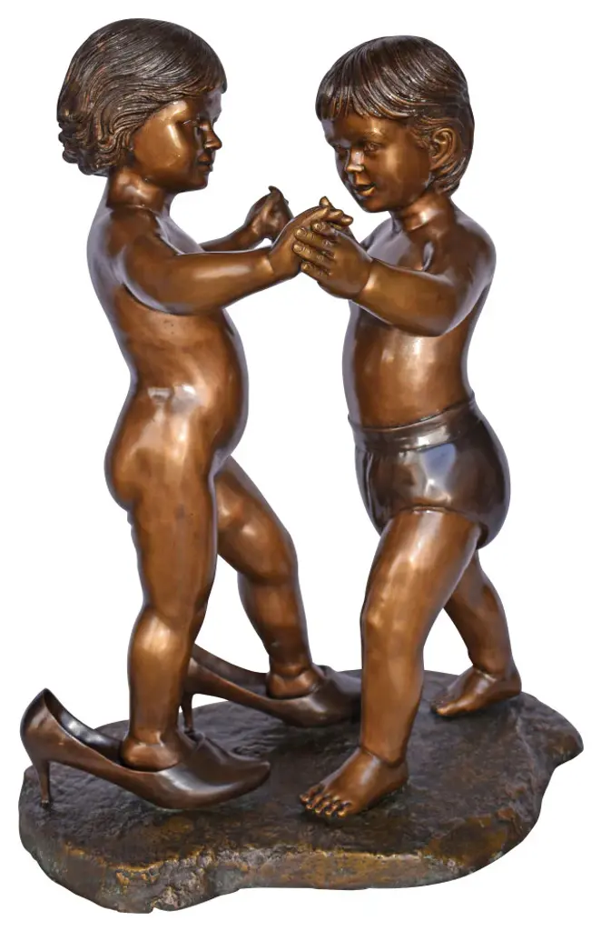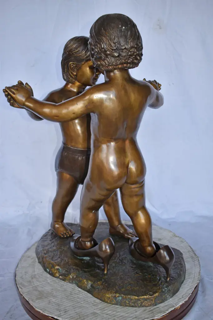 This amazing and creative statue of a young girl wearing mom shoes and dancing naked with her playdate. The sculpture is made with the creation of your imagination. The eyes are of the kids looking at each other, jovially admiring the audience. This bronze statue is cast in the traditional lost-wax method, with brown and green patina finish, which highlights the exceptionally fine detail and guarantees lasting heirloom beauty. The piece would stand out in any room and catch the eyes of any viewer, making it a great addition for any space. Size: 21"L x 15"W x 30"H. Weight is: 50Lb