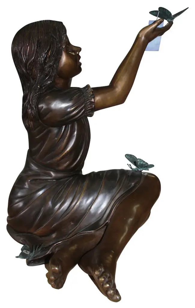 This Bronze sculpture of a young girl marvels at nature''s majesty in the way we long to remember for a lifetime holds four painted, bronze monarchs. Miss Monarch brings a welcome childlike innocence to any home or garden! Since beauty is in the details, our high-quality bronze sculpture, is finished with a multi-toned antique verdigris patina, is sure to bring your home or garden to life. Size: 27"L x 17"W x 24"H. Weight is: 38Lb