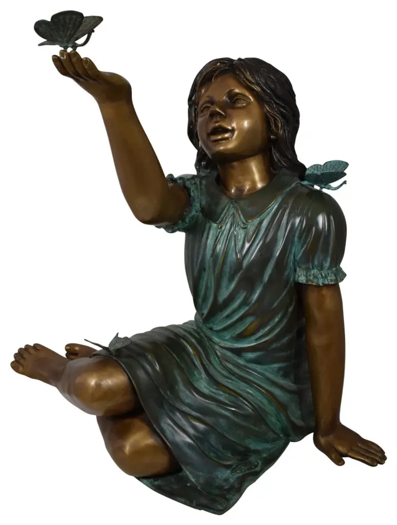 This Bronze sculpture of a young girl marvels at nature''s majesty in the way we long to remember for a lifetime holds four painted, bronze monarchs. Miss Monarch brings a welcome childlike innocence to any home or garden! Since beauty is in the details, our high-quality bronze sculpture, is finished with a multi-toned antique verdigris green and brown patina, is sure to bring your home or garden to life. Size: 27"L x 17"W x 24"H. Weight is: 38Lb