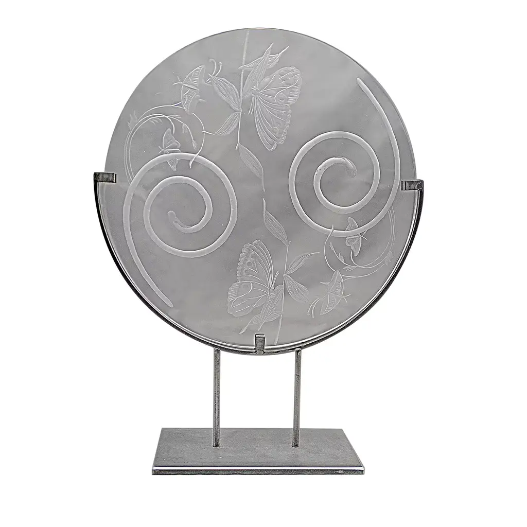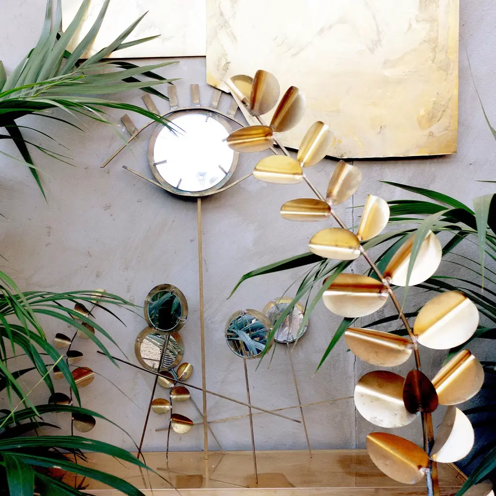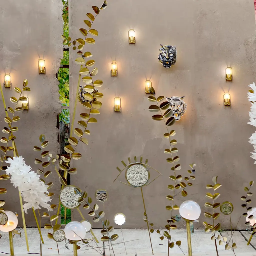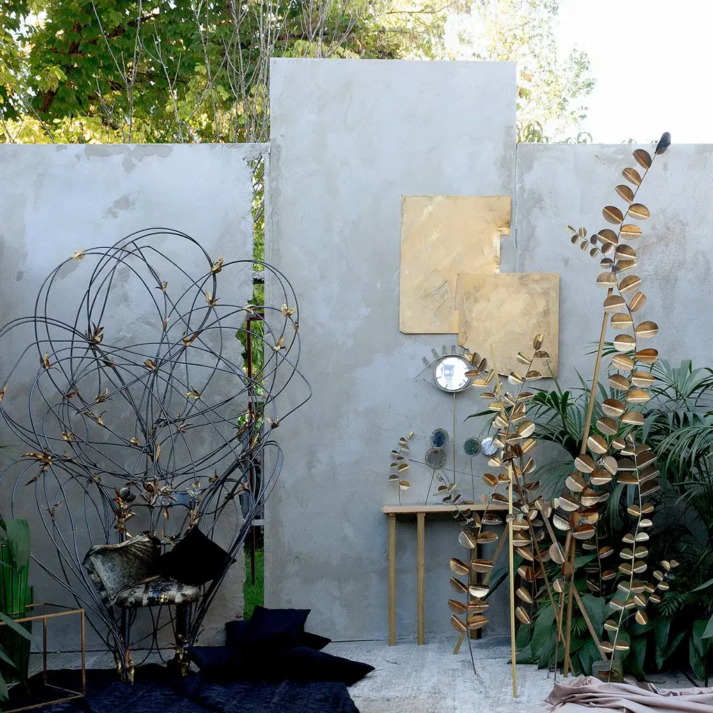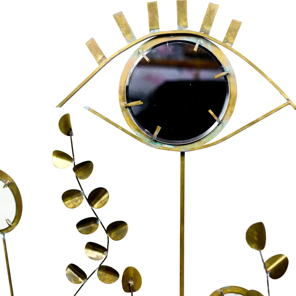 Marked by visual harmony and distinctive aesthetic, this sculpture belongs to the Giungla Aurea Collection (golden jungle in English) including unique pieces of hand-welded oxidized brass on a satin-finished graphite base. This piece consists of three branches and four stems with a round mirror on top, the tallest one depicting a large stylized eye. Part of the stage set from Scene I of “Il grande felino”, the understated golden accents of the leaves and light blue hue of the mirror elements will both attract and reflect the light in a luxurious manner.