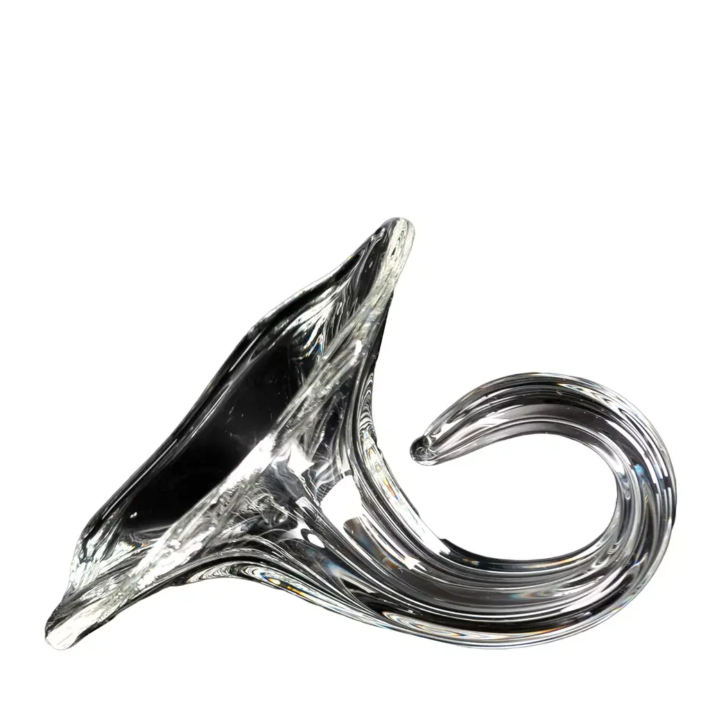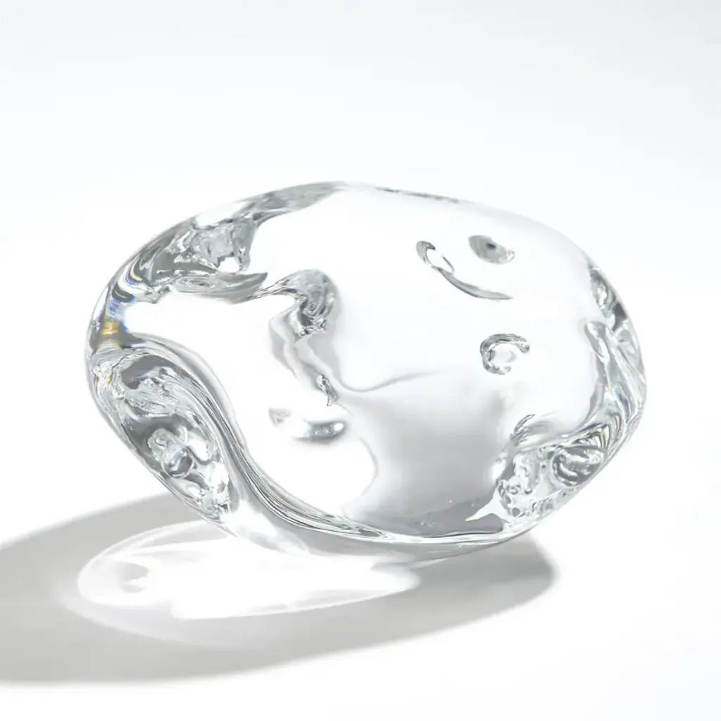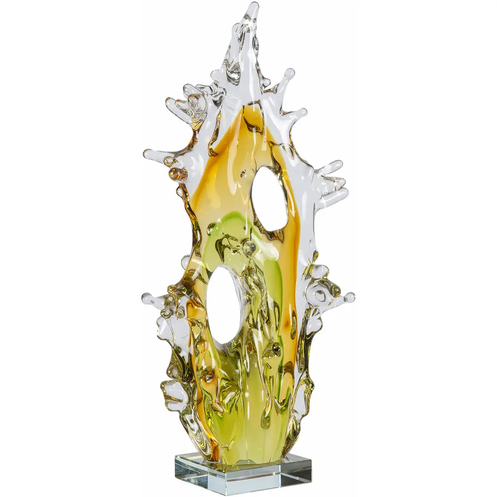 The Glacial Wisp Sculpture seamlessly blends icy tones and textural abstract shapes. Crafted from a clear glaze, the piece takes the appearance of an abstract ice sculpture. The piece gently rests atop a circular base of white marble, beautifully complementing the arctic motif.