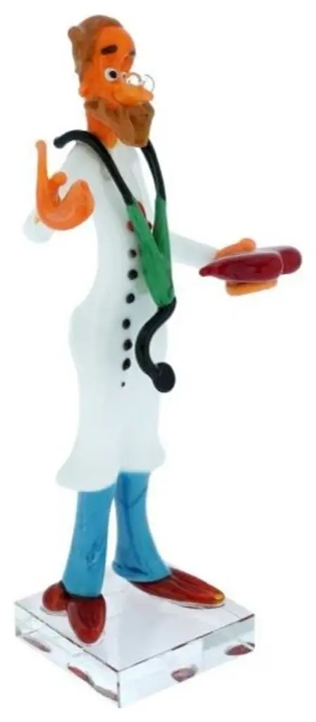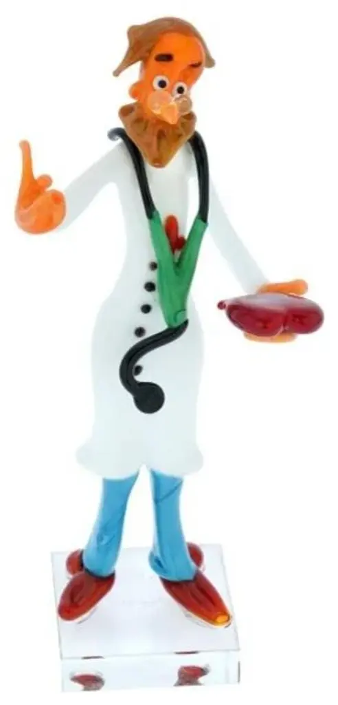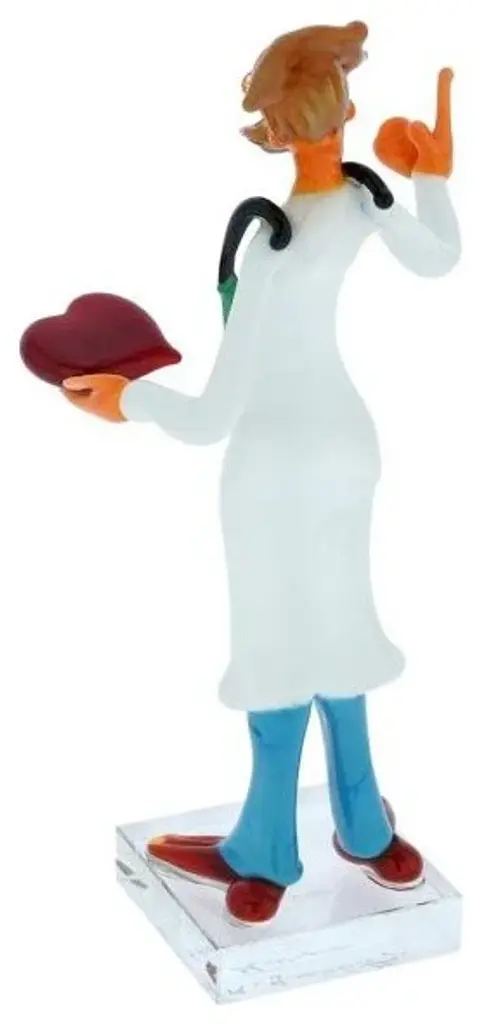 Murano Glass masters for years have been famous as talented artists who watch everyday life and skillfully recreate it in glass. This meticulously crafted Murano Glass Doctor of Medicine is an example of just such a keen eye for detail and artistic vision of the local Murano artisans. With his inquisitive eyes, stethoscope, and the red heart in his hand, this medical doctor figurine symbolizes the caring nature of the physicians of all specialities and their utmost regard for human health and life.Give this fine Murano Glass Doctor figurine to a special doctor in your life as a token of appreciation, or display it at home as a beautiful example of Murano Glass art .• Measurements: The medical doctor sculpture measures around 6 inches in height and 2-1/2 inches in width. The clear glass square base measures 1-1/2 on each side.• Made entirely by hand in a traditional Murano workshop by a family that has been making Murano Glass for several generations.• This physician figurine features the signature of the artist on the base.• The doctor sculpture comes well packaged to avoid damage in transit and comes with the certificate of authenticity.• Because each Murano Glass piece is a unique work of art made by hand, some variations of shapes, sizes, and colors are possible.