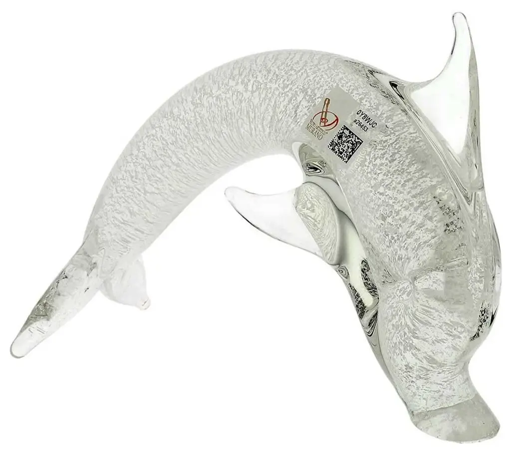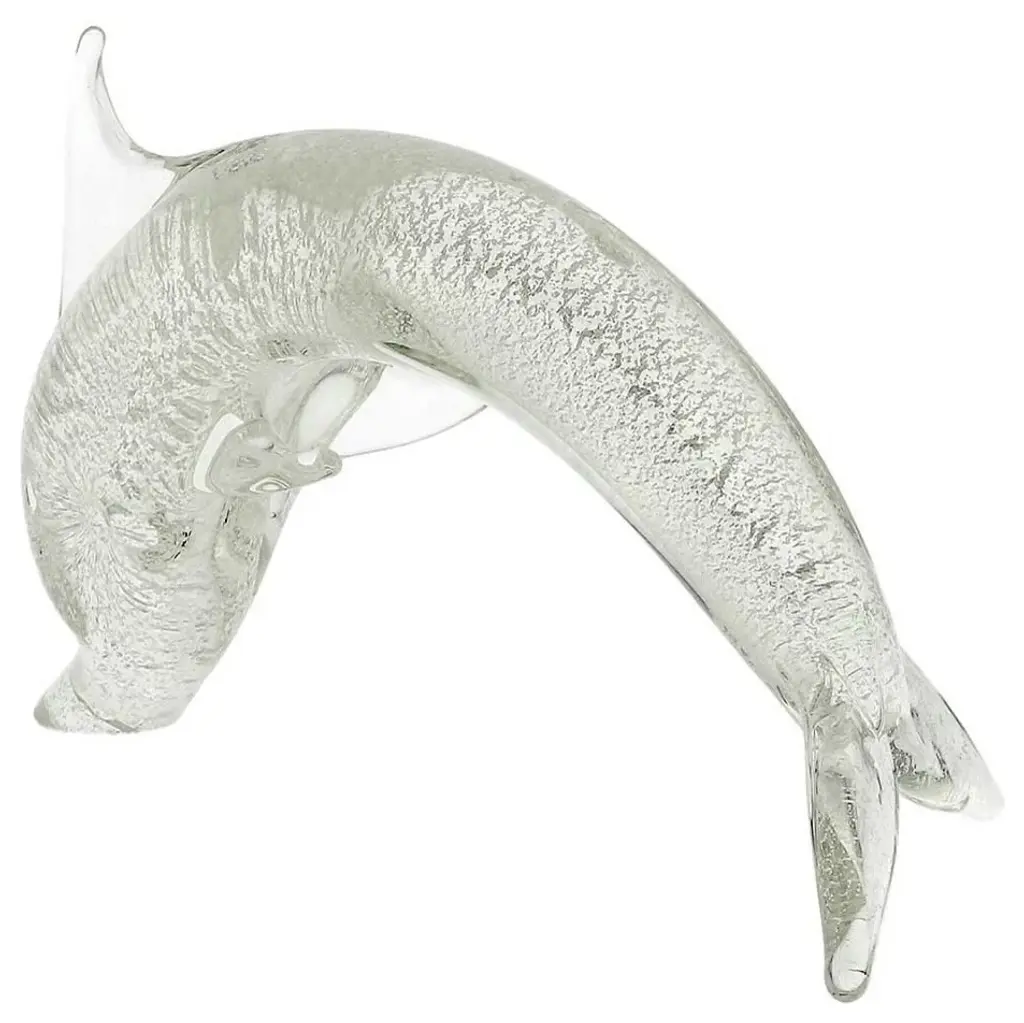 This playful Murano Glass Dolphin was created in a traditional workshop on Murano island using the sought-after silver leaf technique where .925 Sterling Silver foil is infused into cristallo glass under high temperatures in special glass-making furnaces. This results in beautiful sparkling appearance of silver dust captured inside translucent glass body of the dolphin. This elegant dolphin sculpture will make a rich artistic accent in your home or office and will instantly carry you away into the beauty and magic Venice, itself exquisite and elegant creature of the sea.Measurements: The dolphin sculpture is about 8 inches long, 6 inches high and 3 inches deep. It is very well packaged to avoid damage in transit. Authenticity: This Murano Glass dolphin is 100% authentic, crafted by hand in a traditional workshop on Murano island in Venice. It is signed by the artist and features the original sticker of the official Murano glass-makers'' consortium, it is also accompanied by the certificate of authenticity.As this Murano Dolphin is a unique artistic sculpture made by hand, some variations of colors and patterns are possible. These do not constitute a defect but rather are the very features by which experts recognize authentic Murano Glass.