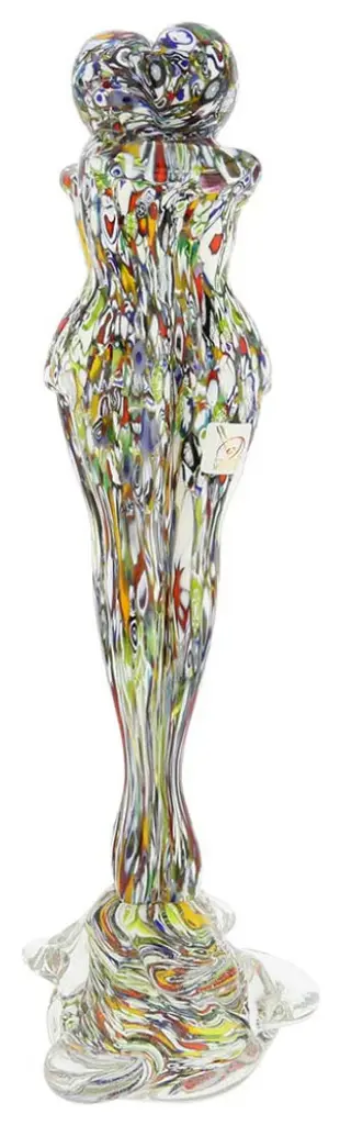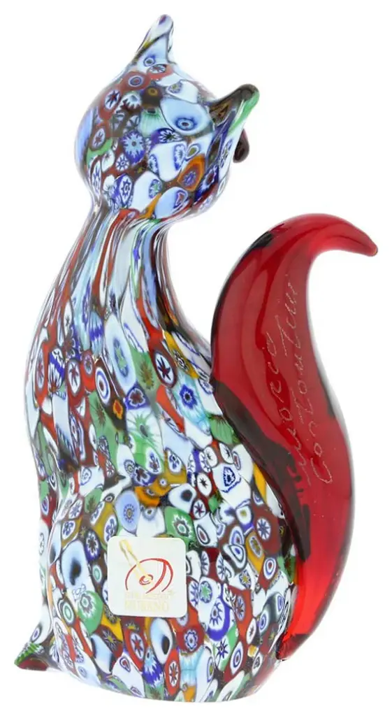 This charming Murano glass cat sculpture represents the long-running artistic tradition of Murano glass combined with ingenuity and technical virtuosity of Murano glass masters. Using the most famous and distinctive ancient Murano glass technique- Millefiori (a thousand flowers), Murano masters created this elegant cat sculpture with the body of vivid stylized flowers and the eyes, nose, and beautiful tail in rich ruby red glass for a striking artistic effect. This lovely cat will make a perfect adorable addition to your home or office and will bring a touch of Venetian elegance and charm into your life. This graceful Murano cat sculpture also makes a uniquely appropriate luxurious gift to any cat lover or anyone who loves Venice and appreciates its artistic and historical traditions.• Measurements: Murano Glass cat figurine is approximately 6 inches tall and 3 inches wide in its widest part.• This fine Murano glass cat was handcrafted using only traditional glass-making methods by a third-generation Murano maestro, whose work is displayed at exhibitions and in museums worldwide.• This Murano glass cat sculpture is signed by the master. The attached sticker further proves its Murano origin, as does the certificate of authenticity that comes with the cat.• Because each item is a unique work of art made by hand, slight variations of sizes, colors and patterns are possible.