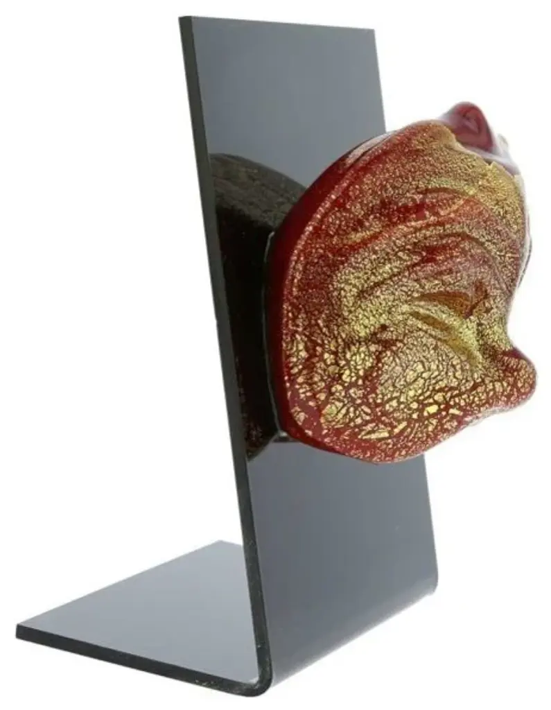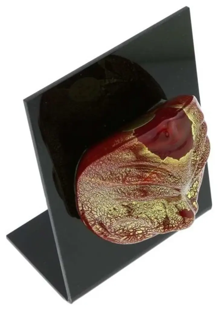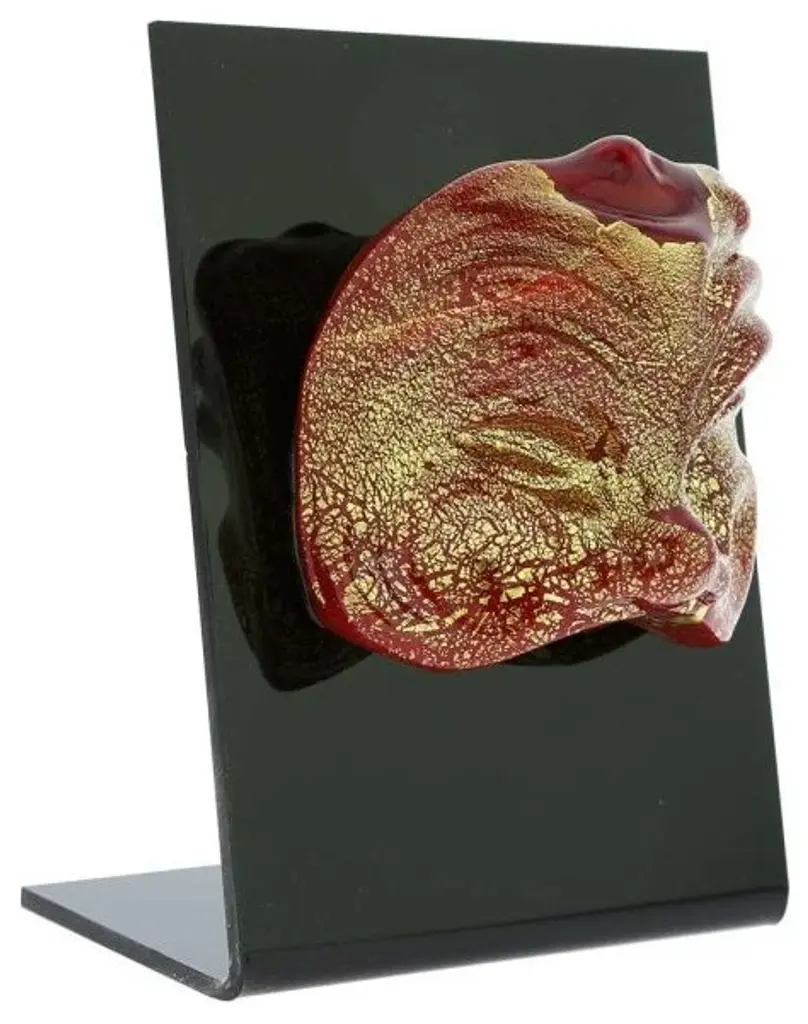 Originating in the street performances of Commedia dell''Arte in medieval Italy, Venetian masks symbolize mystery, frivolity, and the festive spirit of revelry, which are still felt in Venice during its famous Carnival. The unequivocal symbol of the Venetian Carnival, the Venetian mask is an art form in and of itself, one that has been explored by mask-makers of Venice and Murano Glass artisans alike. This exquisite Murano Glass mask is a special kind called Bauta, which was one of the most popular masks and, together with a black or red cape, became the standard carnival outfit for men since the 18th century. Today''s masks run the gamut but Bauta still remains the classic Venetian mask of choice for the Carnival. This mask crafted in an old traditional workshop on Murano island is a fine expression of all that makes Venetian Carnival so famous around the world. The dark red grotesque face with fine features and the rich dusting of 24 karat gold evokes the typical themes of the carnival: the drama of the mysterious encounters set against the opulence of the costumed balls. Now you too can accentuate your home with a decorative Venetian mask and bring the spirit of the carnival into your life.• Measurements: This Murano Glass mask is attached to the base, which measures 5 x 4 inches. The mask itself is approximately 3 inches high by 3 inches wide and 1-3/4 deep.• This decorative Venetian mask is an authentic Murano Glass sculpture handmade according to the techniques and traditions of Murano Glass craftsmanship.• Each mask has an attached authenticity sticker and comes with the certificate of authenticity in Italian and English.• Because each figurine is a unique work of art made by hand, some variations of sizes, colors, and patterns are possible. These do not constitute a defect but rather prove that this is an original one-of-a-kind artisan creation.