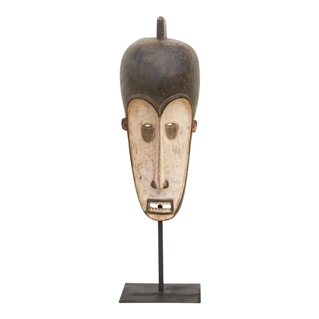 The Glazed Masks Set was created by Thai artist Arjan Deng, who is known for his one-of-a-kind ceramic statues of emotionally evocative faces. This is his interpretation of a trio of characters: a male in the center flanked by two slightly smaller females. The faces sitting atop black iron bases have assorted glazes on them so each will vary from piece to piece, which makes each set unique. The tan sculptures will be whimsical elements in a space.