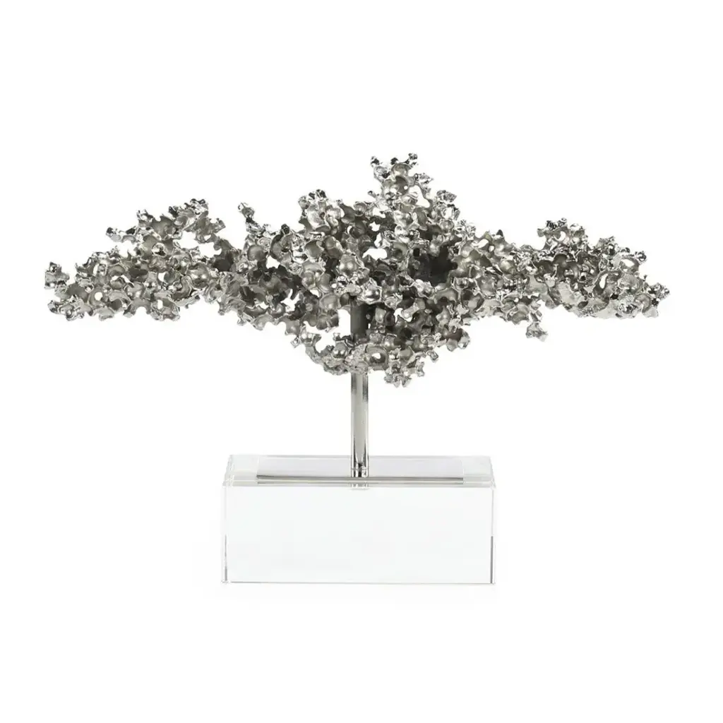 The Gleaming Leaf Sculpture is a stunning interpretation of a gorgeous natural form. Crafted from enameled aluminum in a Nickel finish, the piece depicts a majestic leaf that stands proudly atop a square base of marble stone. The opulent, metallic leaf displays subtle splashes of blue that line the interior folds, contributing an additional layer of visual depth.