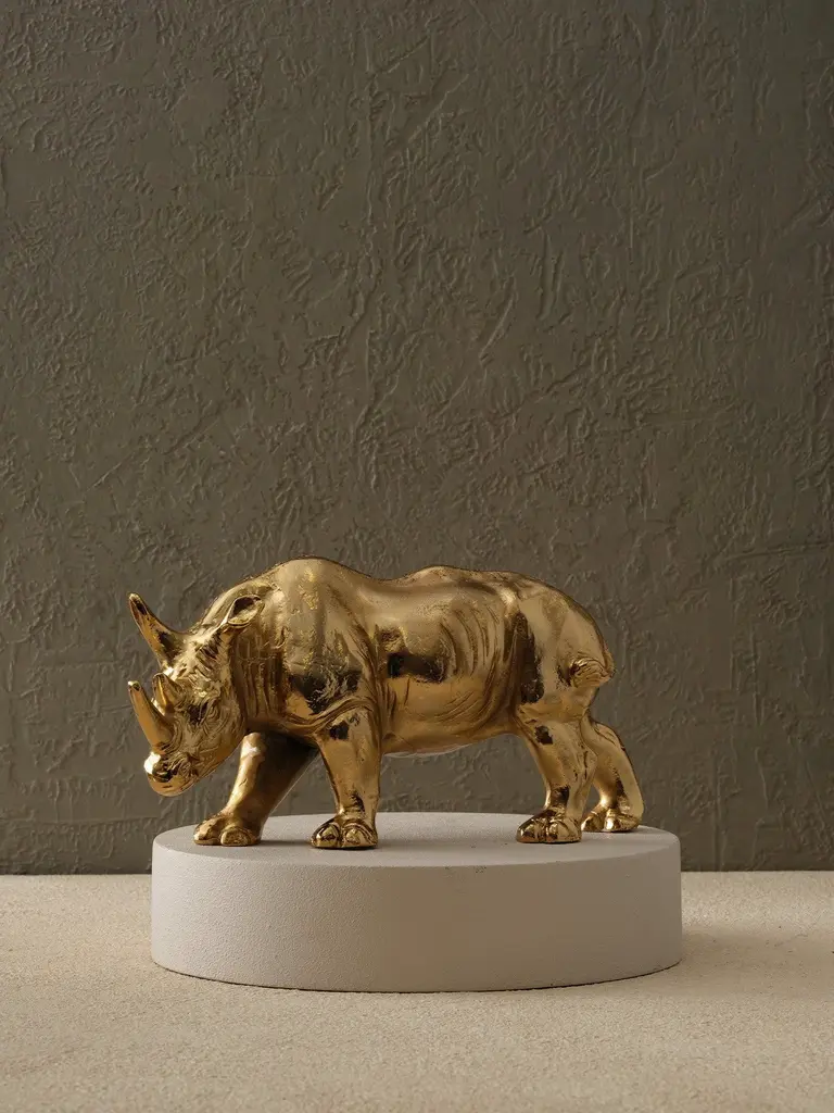 Commanding attention with its powerful stance and gleaming finish, this Gold-Plated Rhino Sculpture is a striking symbol of strength and resilience. Perched on a minimalist stone base, the piece balances raw power with refined elegance, making it an eye-catching addition to any curated space. Whether styled on a coffee table, bookshelf, or console, this sculpture infuses your interior with bold character and sculptural sophistication. Handcrafted with care, it's a statement object for the design-conscious collector.