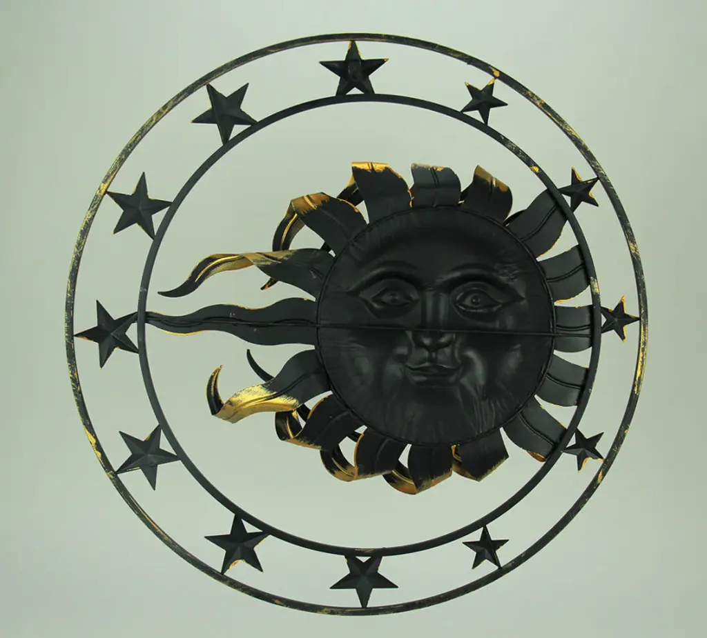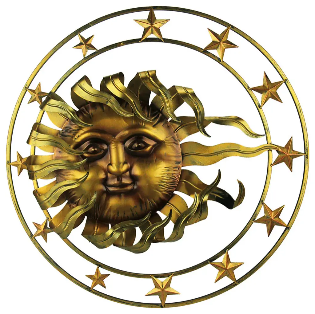 30 Inches in Diameter, 6.5 Inches WideCreativley Crafted of Metal in a Dimensional Design That Creates Movement Though it is Sitting StillMulti-Tone Metallic Gold Finish Gives it a Stunning Loustrous LookA Stylish Celestial Home Deocr Accent You Can Hang AnywhereBrings Artful Inspiration to Your Indoor or Outdoor DecorA celestial sun and stars hand in harmonious balance even when the wind blows. The suns rays dances with the stars as they surround the sun inside their circular frame. A multi-tone golden finish gives it a lustrous look that brightens up any space. Display it on a focal wall anywhere indoors or display outside near the front entry. Hang it by the pool, on the patio or on a fence to bring a little life to your yard or garden. This 30 inch diameter, 6.5 inch wide wall sculpture brings personality and a lot of celestial character to your indoor or outdoor decor.