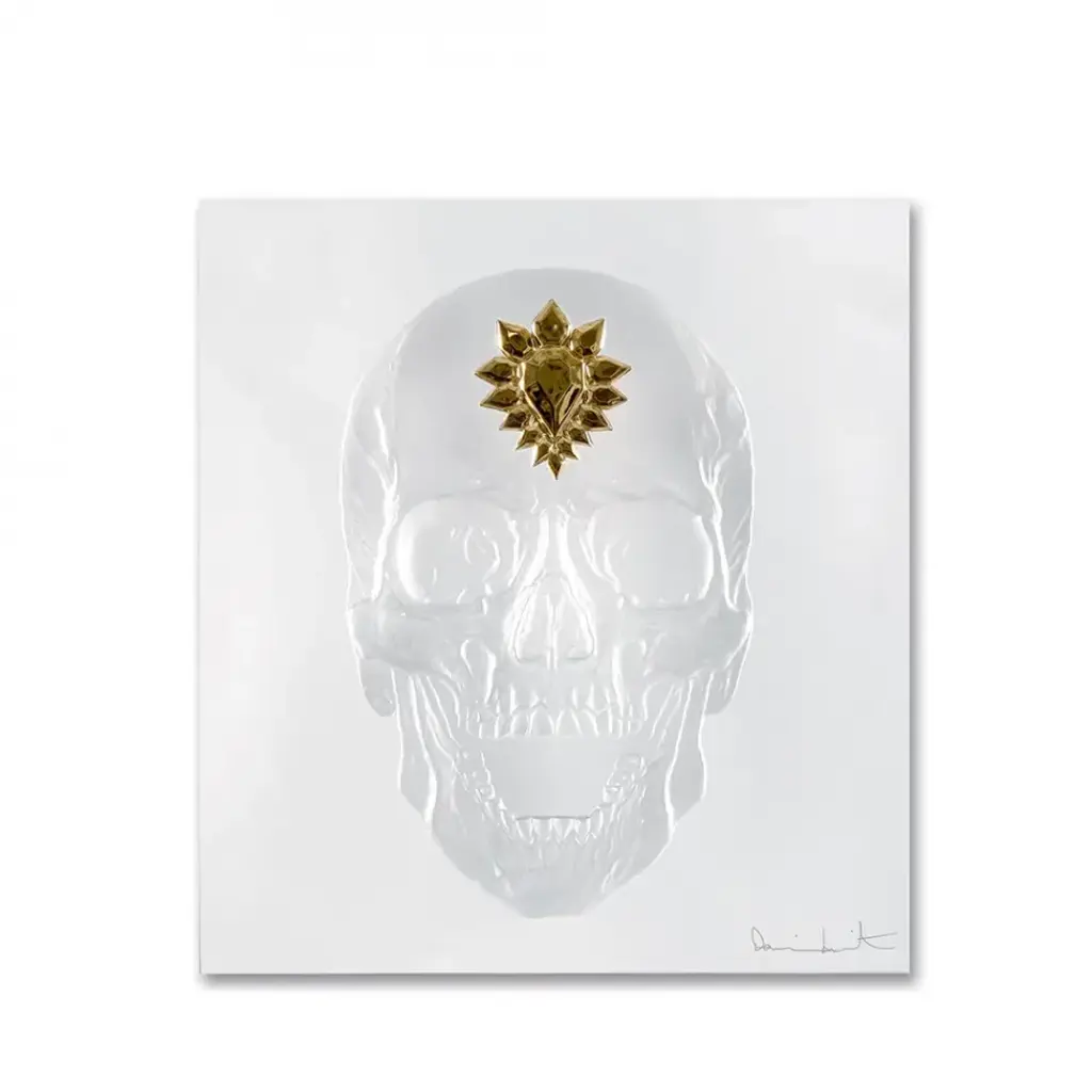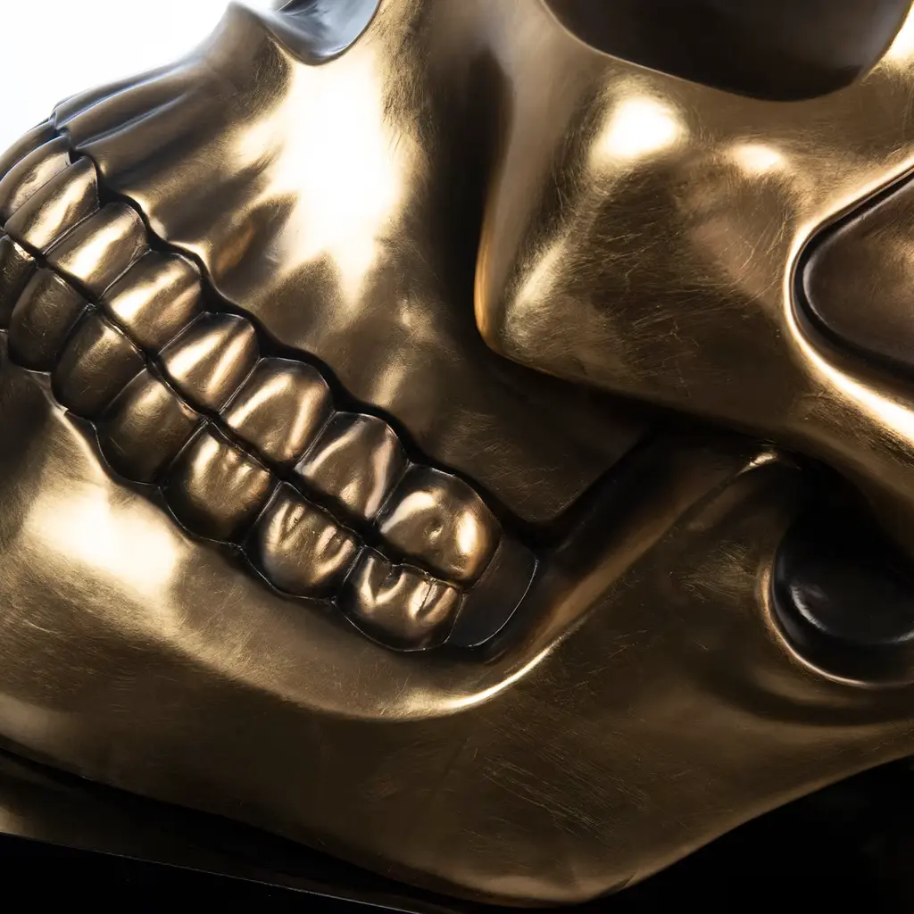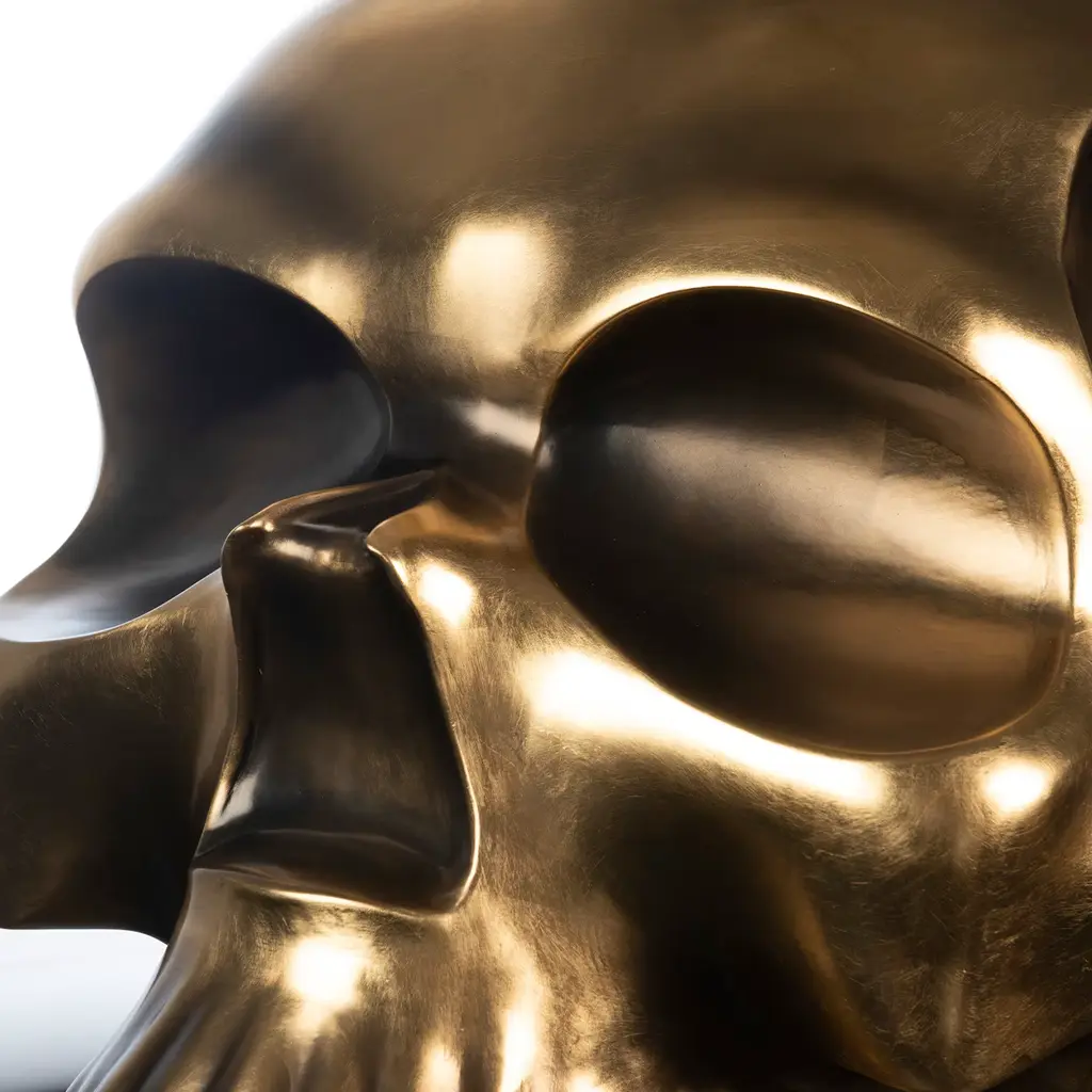 Finished in a mesmerizing golden shade obtained with antiquated gold leaf, this spectacular skull sculpture will add a luminous, fascinating accent to any tabletop of a contemporary interior. Entirely handmade of ceramic, This piece will enrich an entryway or living room with unrivaled sophistication. The support/base does not come with the piece.