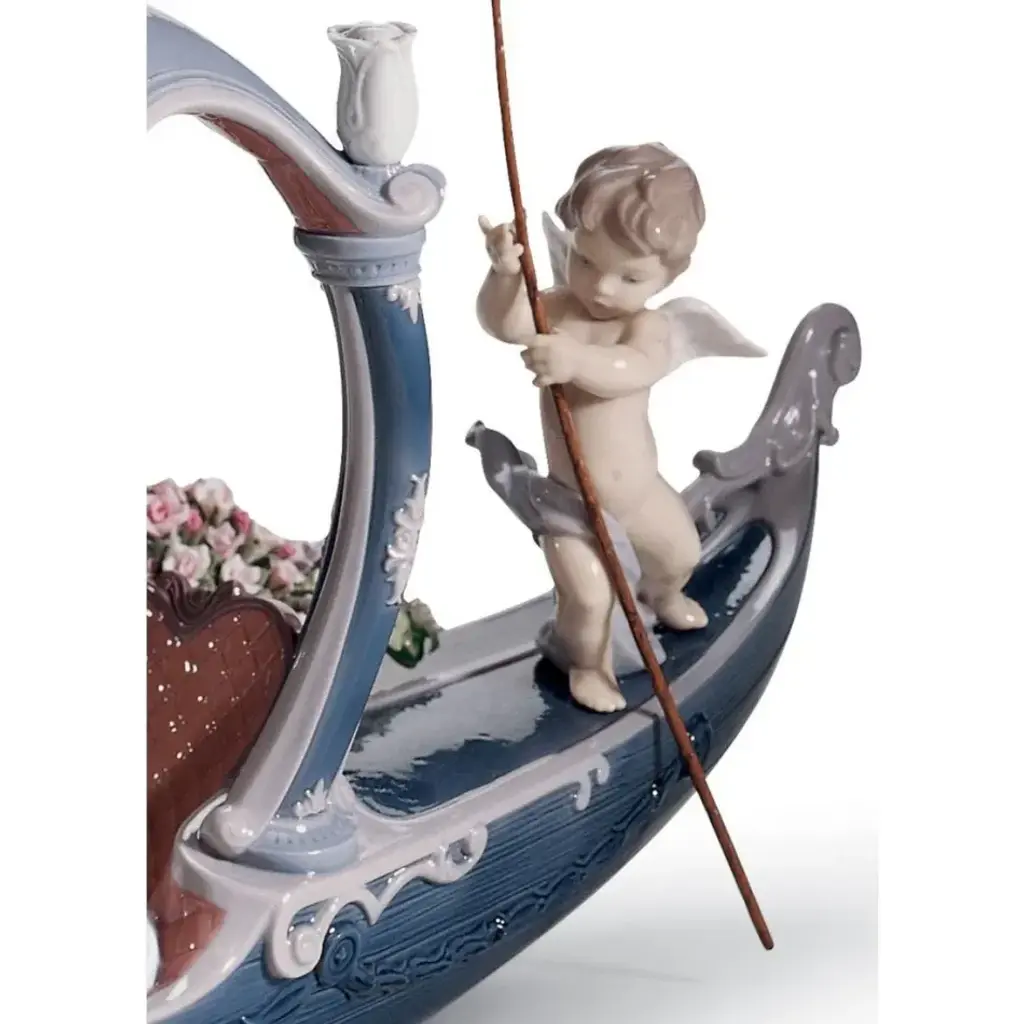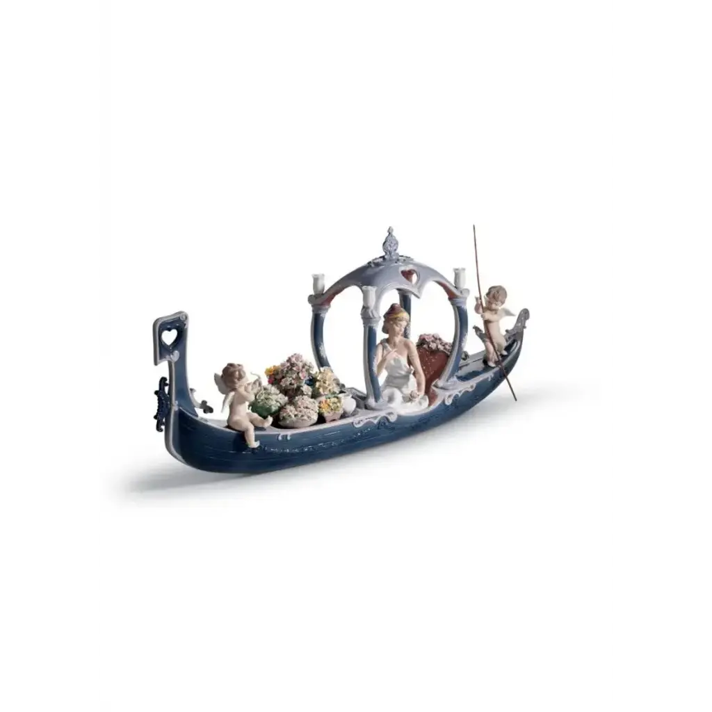 Limited series porcelain sculpture of a goddess in a gondola full of flowers accompanied by two little angels, one with an arch and the other rowing with a wooden stick. An iconic Spanish brand, Lladro is a world leader in the creation of porcelain art. Started by brothers Juan, Jose and Vicente Lladro in 1953, the ceramic figurines were initially inspired by the works of great European manufacturers like Meissen and Sevres. Over time, a unique style was forged, consisting of elongated lines, a revolutionary single-firing method, and soft pastel tones.