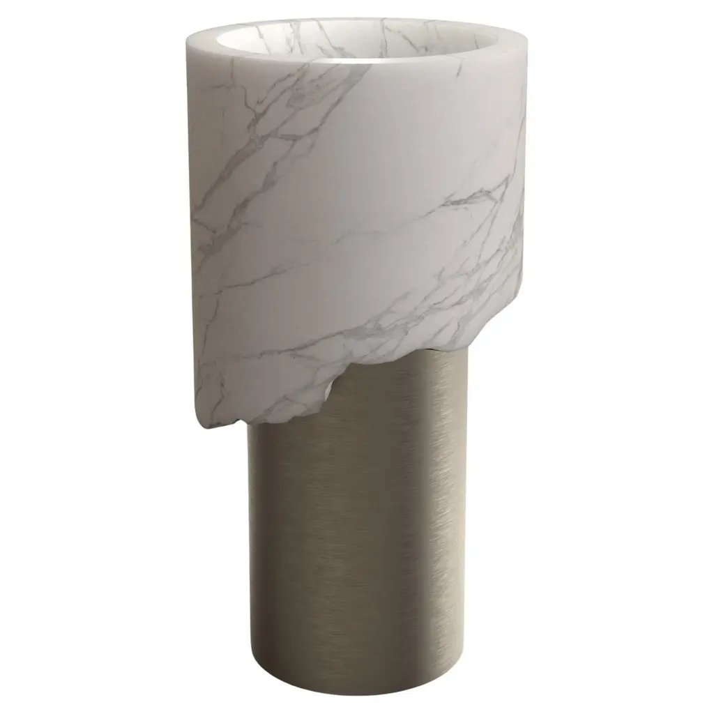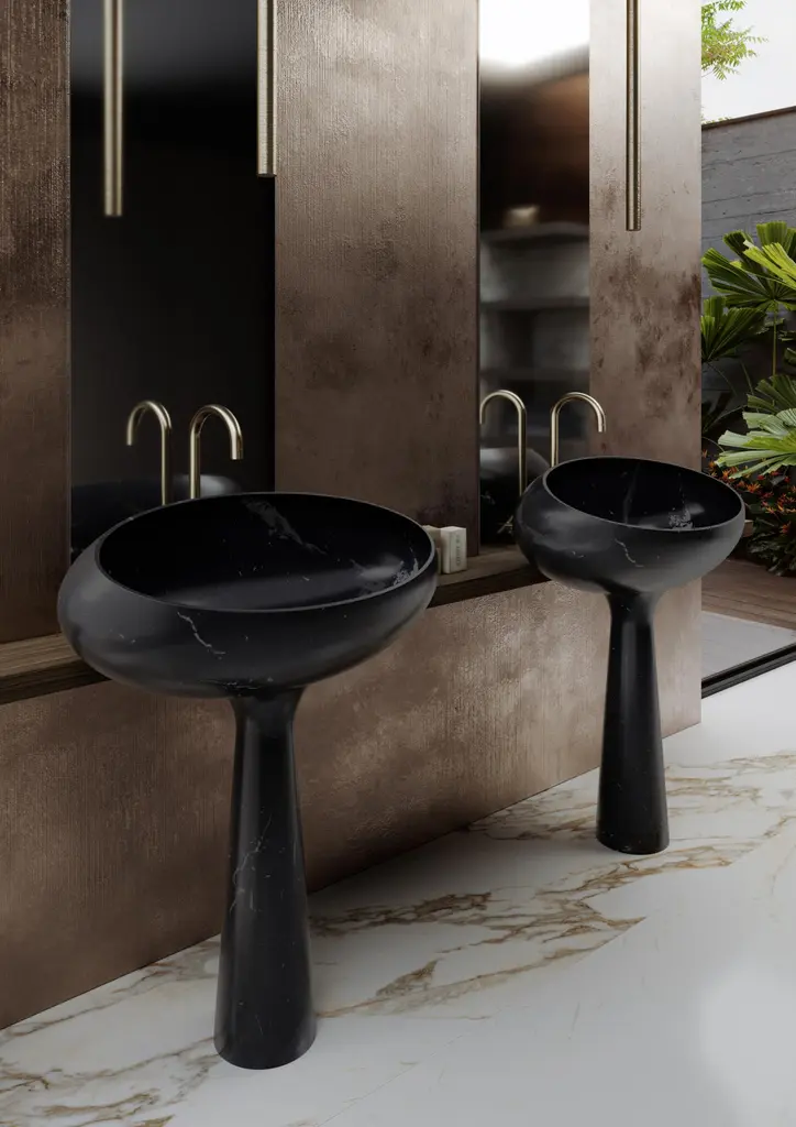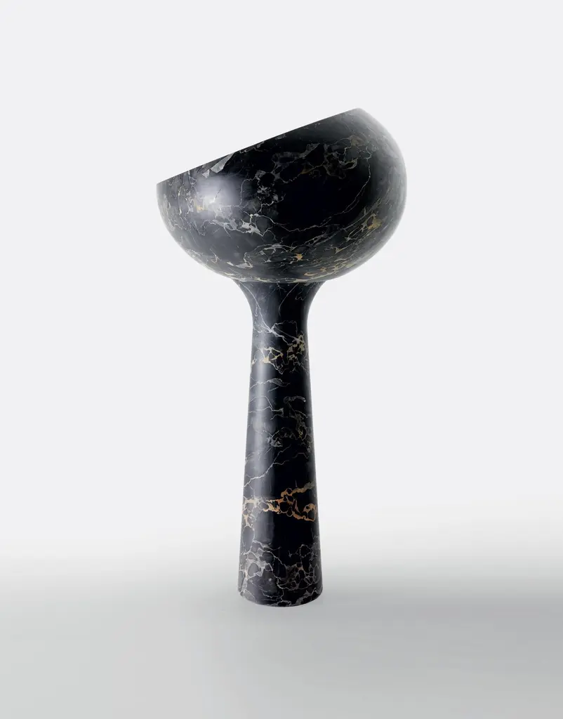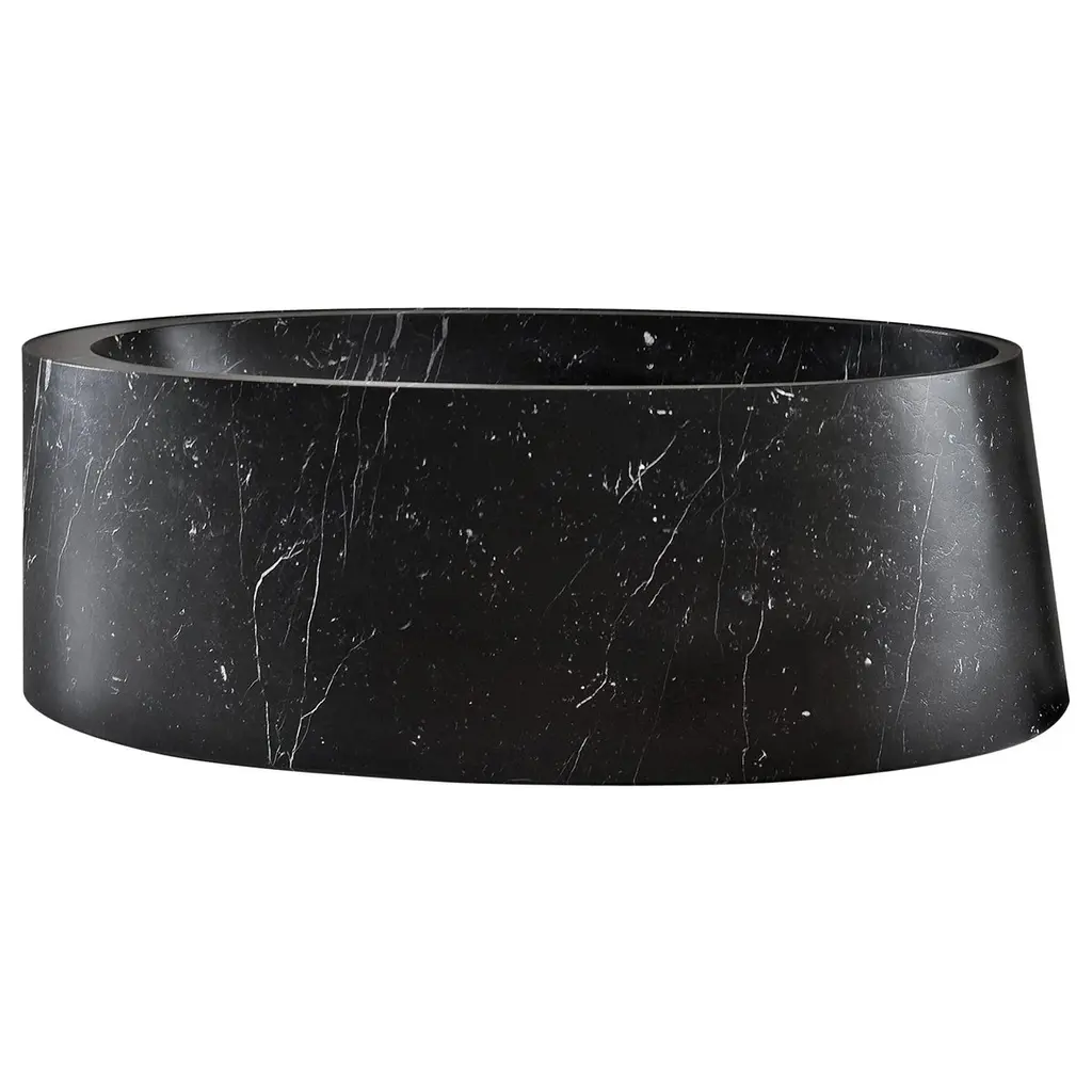 Gong Freestanding Basin by Kreoo Designed by Christophe PilletDimensions: D 50 x W 80 x H 102,5 cm.Materials: Nero Marquina marble.Weight: 89 kg.Available in different marble and travertine options. Please contact us.The softness of pebbles, which are worked by the action of water, inspires the aesthetics of the Gong collection, which includes freestanding and countertop washbasins where marble fully expresses its value and natural background.The ellipsoidal shape of the bowl, in two sizes for both versions, emphasizes the nuances of the material, which can be chosen from the ten proposals in the catalogue. At the same time, the diagonal cut of the volume gives it a unique and distinctive design.The result is an oval carved out with a meticulous and excellent technique, whose internal surface can also be realized in contrasting colours, with a materic and precious coating in different colours.In the freestanding version, the base is crafted from a single block of marble and has an elegant tapered profile that supports the washbasin, available in ten different types of marble.Kreoo: the new marble experienceKreoo links its name to the best Italian tradition in marble manufacturing and brings to new light the primordial charm of a material that has witnessed the evolution of civilizations and cultures.From the bathroom and living room to coverings, home accessories, and lamps, the company works with natural stone in various forms and aesthetic compositions, enriching it with other materials such as metals, wood, and glass. The result is a fascinating and chromatic language, suitable both indoors and outdoors. Expressed in contemporary but still customizable designs, Kreoo highlights workmanship know-how and excellence.The brand, born in 2010 by the experience of Decormarmi and its worldwide distribution strength, has led to major international projects, especially in hospitality and luxury residential.