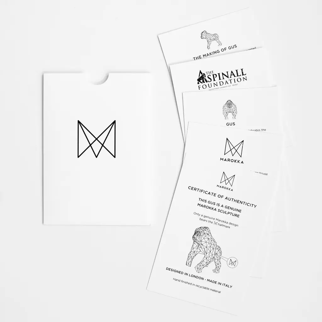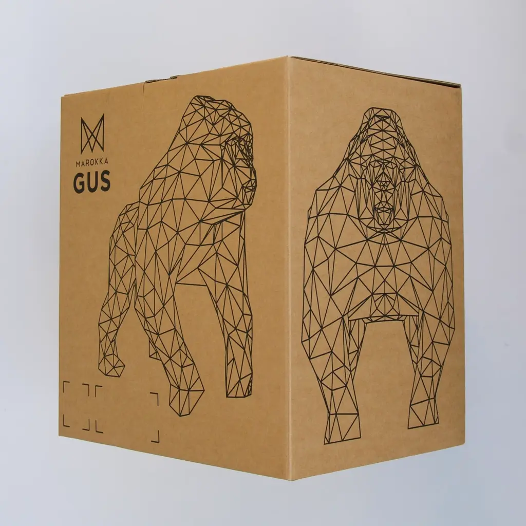 Frank was lonely so we created him a friend our Gorilla called Gus.Marokka's unique sculpture, King GUS, took pride of place in London's Broadgate in the summer of 2017. Mini Gus soon followed.In this stunning multi faceted sculpture, the intricate character and magnificence of the gorilla shine through. Gus and Marokka are proud to support internationallyrenowned conservation charity The Aspinall Foundation.Take a touch of the wild home, and for every Gus sculpture sold, Marokka will donate £10 to The Aspinall Foundation.Take a little WILD LIFE home with you.Hand finished in recyclable plastic.Every Gus comes with his certificate of authenticity and in his own Eco-friendly packaging.Designed in London, Made in Italy.