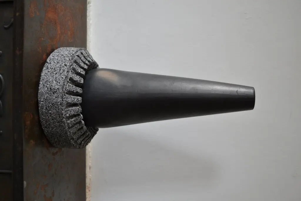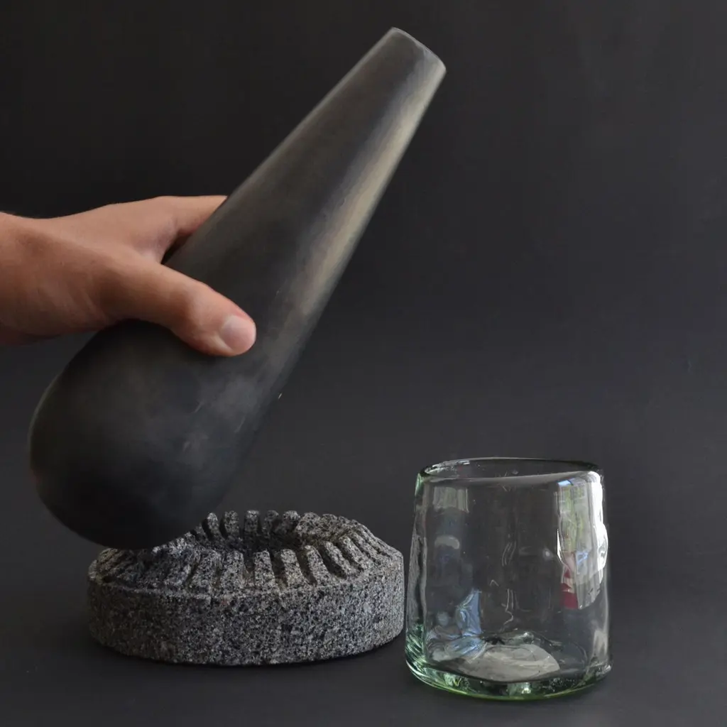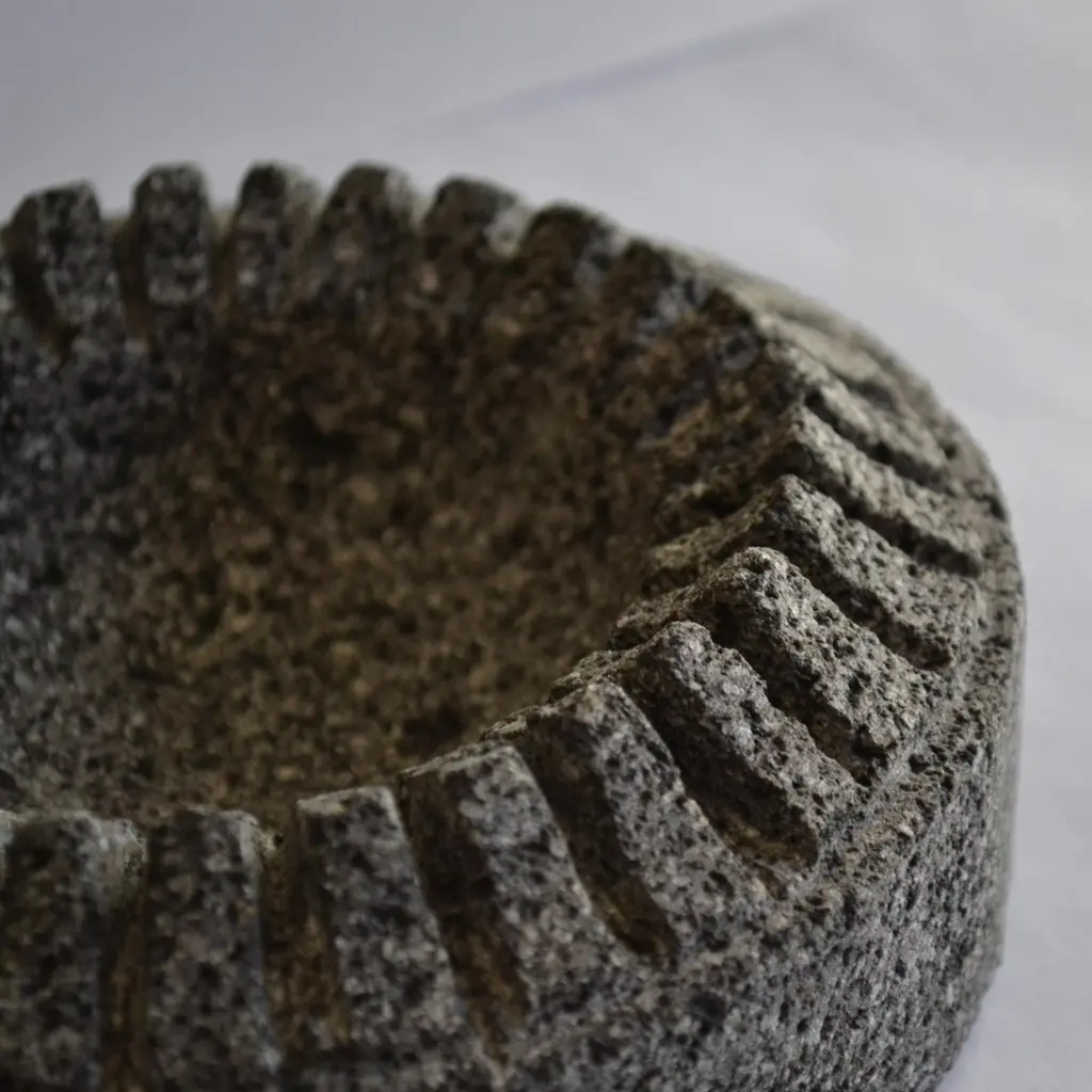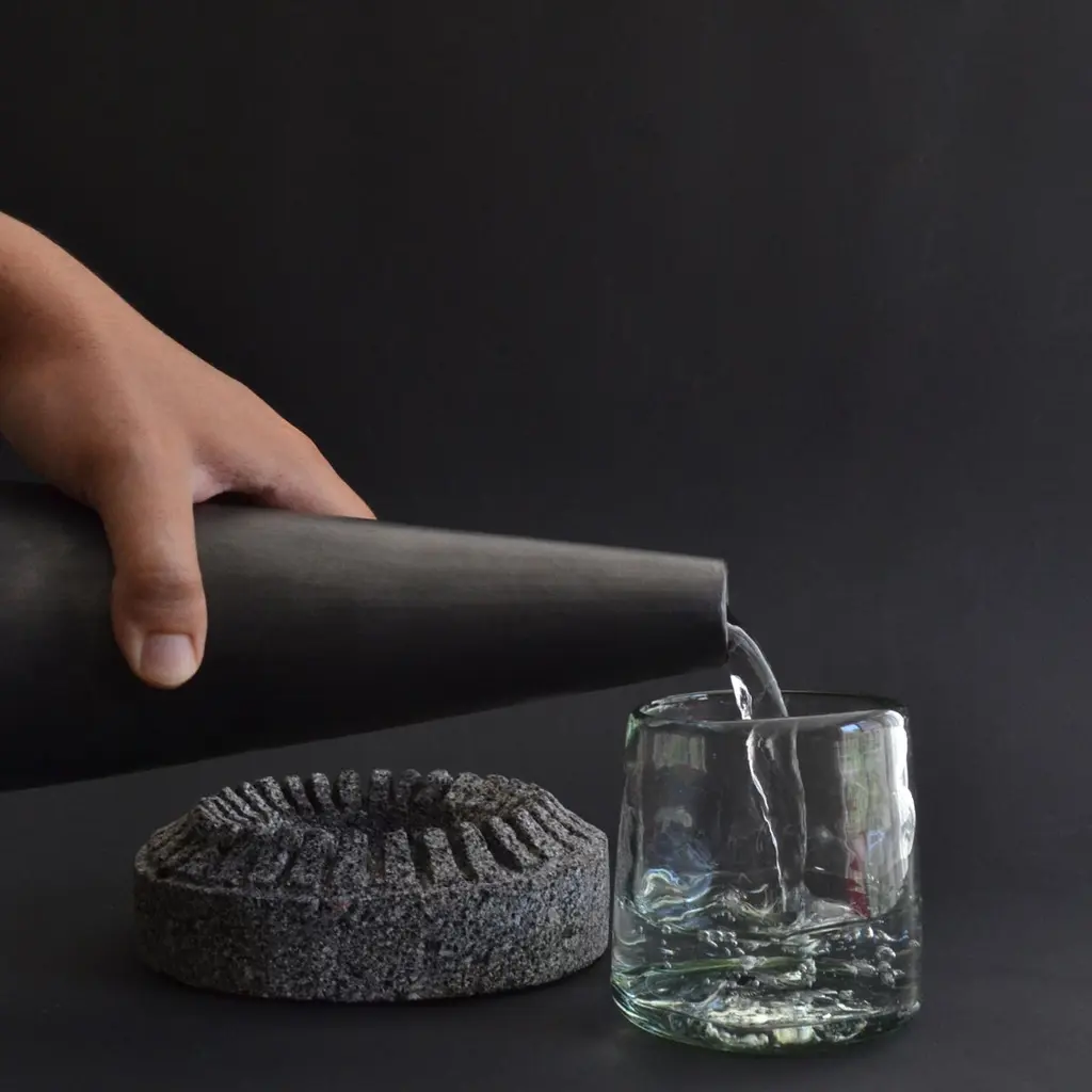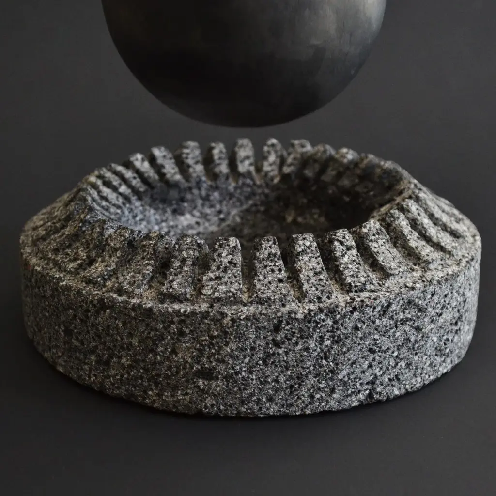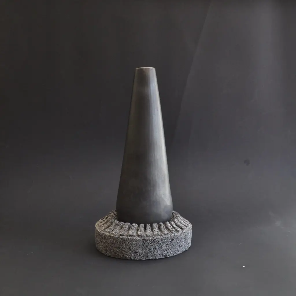 Gota decorative piece by Omar Ortiz, 2021Dimensions: H15 x D30cm.Materials: Volcanic stone, black clay.It is a decorative piece that mixes black clay from Oaxaca and stone from Jalisco. La Muerte Tiene Permiso CollectionIn pre-Hispanic cultures it was believed that the mountains were home to the gods. The pyramids repeated the shapes of the nearby mountains. These same civilizations forged their identity in stone, with sculptures, stelae, columns and pyramids among others. The collection explores the handcrafted and symbolic elements of stone. The relationship with clay, fire, water and air to create a cycle within a piece that houses these elements and creates a micro spring. Stone that holds up clay that can contain water or fire to give way to life and the cycle repeats itself over and over again.