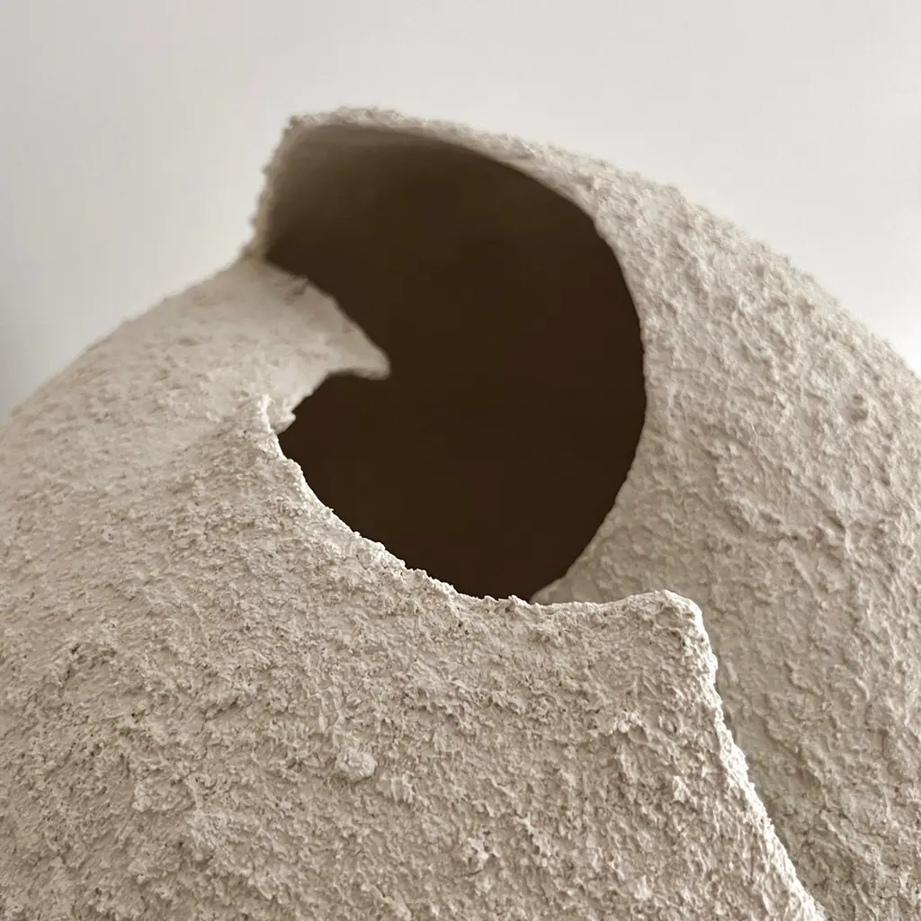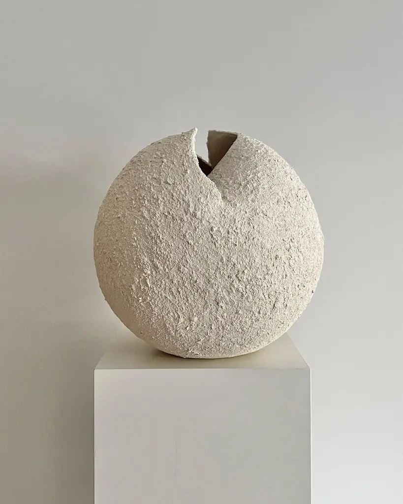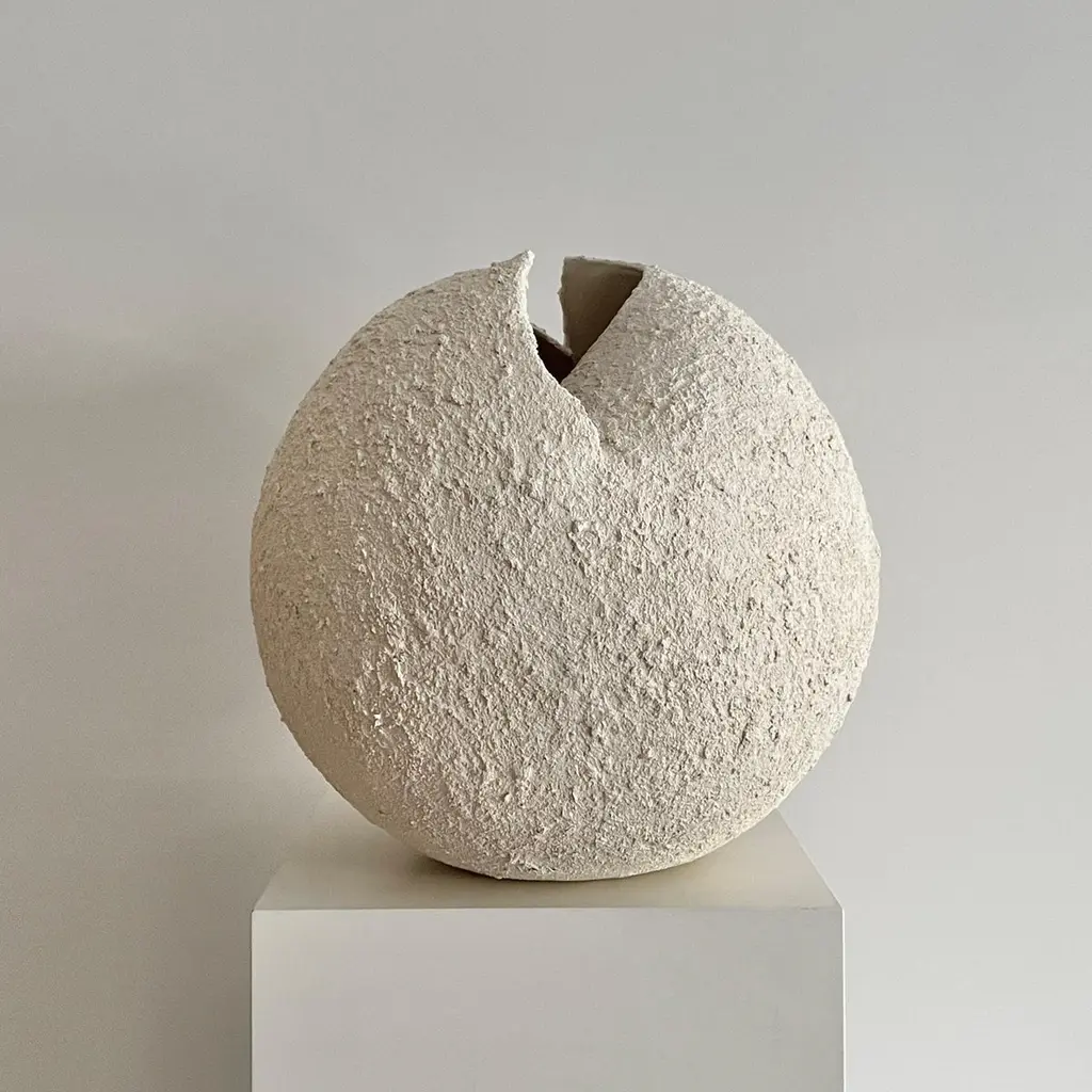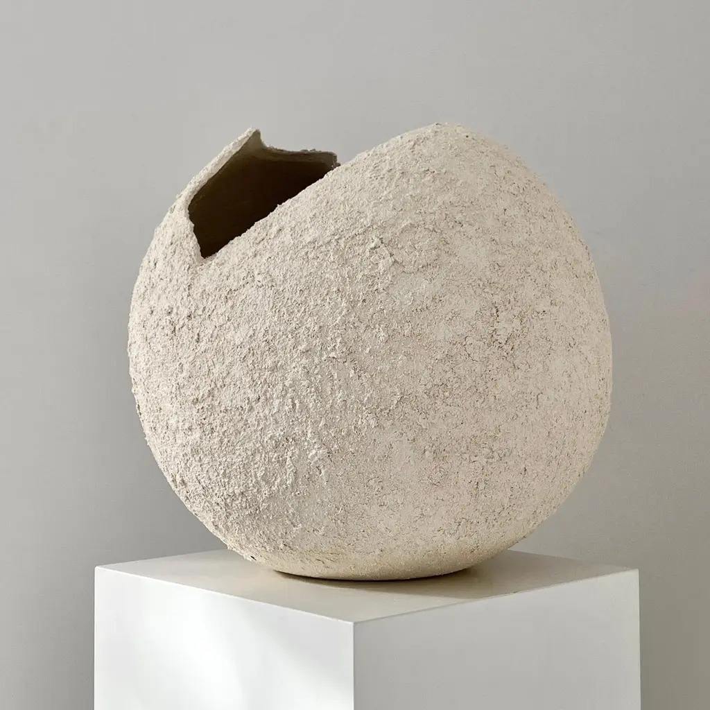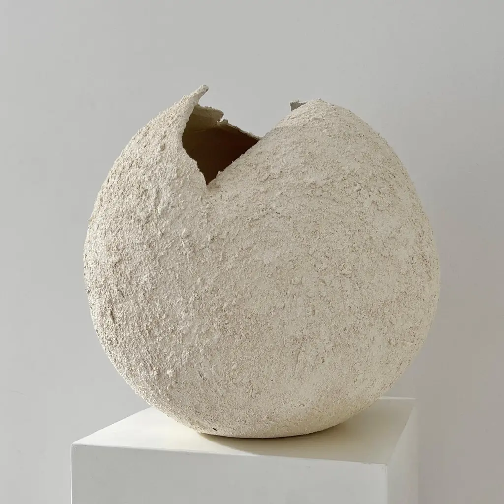 Grain Sculpture by Laura PasquinoOne of a KindDimensions: D 37 cm x H 38 cmMaterial: CeramicFinishing: Textured, UnglazedArtist stamp on the bottom Laura PasquinoIncorporating references from ancient Korean ceramics as well as principles of Japanese aesthetics of wabi-sabi, I am led by experimentation with the pure shape of the sphere. My works, which include both functional vessels and sculptures, are each infused with precious imperfections and minimalist aesthetic. The clay, often coarse and textured, is sculpted, hand-built or wheel-thrown to create a wide range of effects and surfaces.My work embraces simplicity, asymmetry and beauty in understated. The dents and scars add subtle grace and individuality to every piece of work. To honour the raw material of clay, the works are often left unglazed.Each artwork is crafted by hand from natural stoneware clay compound and is one of a kind. My aim is to give character to the piece, rather than trying to make it perfect. I leave my fingerprints and tool marks as they happen during the creation process. It gives soul to the object and is a trace of me from that particular moment. Every artwork comes with a certificate of authenticity from the artist.