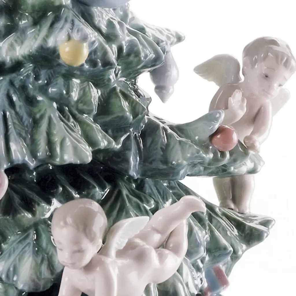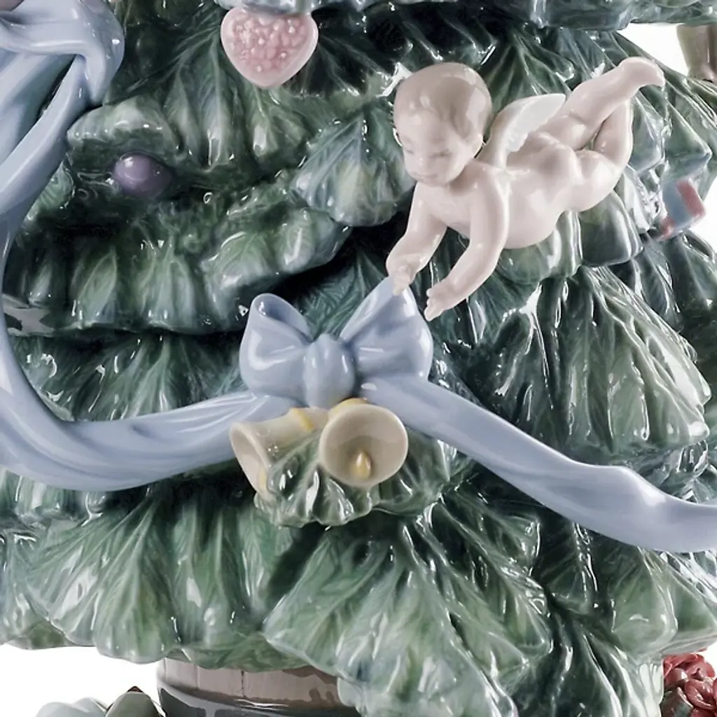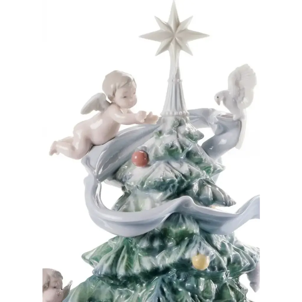 The Great Christmas Tree Figurine from Lladró brings Christmas magic to life through playful cherubs adorning a majestic evergreen. Delicate ribbons swirl around the carefully detailed branches, while miniature angels appear to dance among ornaments and wrapped presents at the base. A radiant star crowns this porcelain masterpiece, which rests on a commemorative base inscribed with seasonal greetings. Designed by Virginia Gonzalez, the handcrafted details of this figurine extend to tiny gift boxes with sculptured bows and intricate patterns that surround the tree's foundation.