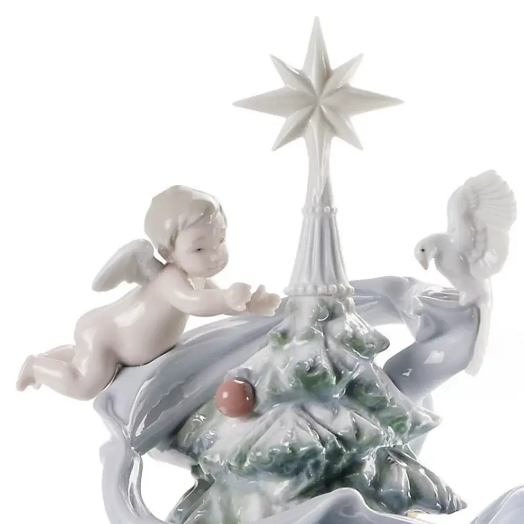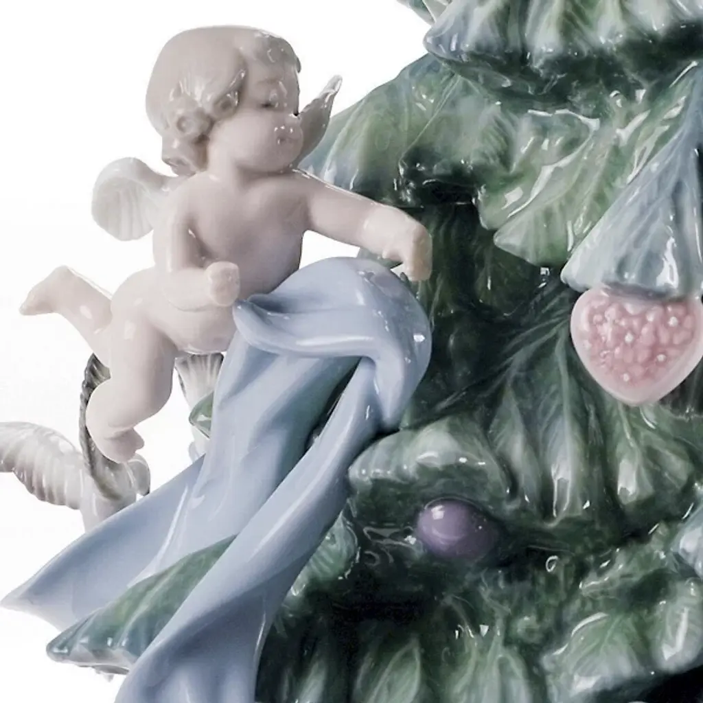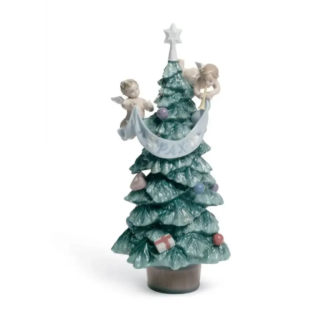 The Great Christmas Tree Figurine from Lladró brings Christmas magic to life through playful cherubs adorning a majestic evergreen. Delicate ribbons swirl around the carefully detailed branches, while miniature angels appear to dance among ornaments and wrapped presents at the base. A radiant star crowns this porcelain masterpiece, which rests on a commemorative base inscribed with seasonal greetings. Designed by Virginia Gonzalez, the handcrafted details of this figurine extend to tiny gift boxes with sculptured bows and intricate patterns that surround the tree's foundation.