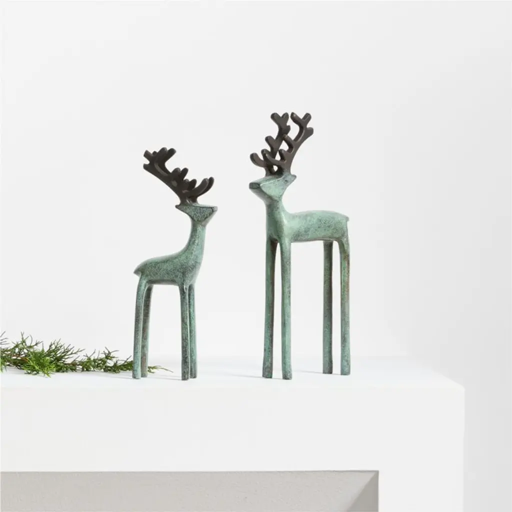 We've updated our bestselling reindeer with a green patina for the look of impeccably aged bronze sculptures. Cast by hand with modern, abstracted silhouettes and flowing curves in durable aluminum, the reindeer is sculpted with elongated legs and rounded cuteness that add a playful element to holiday decor. A verdigris finish gives it the unique color, subtle texture and charm of a flea market find. Due to the artisanal patina created by hand, each caribou is fascinatingly unique. Group with our other exclusive reindeer sculptures to create a miniature herd on your fireplace mantel, buffet or dining room table.