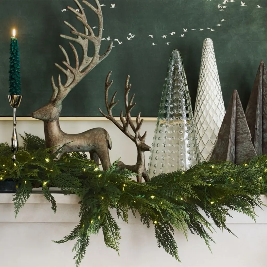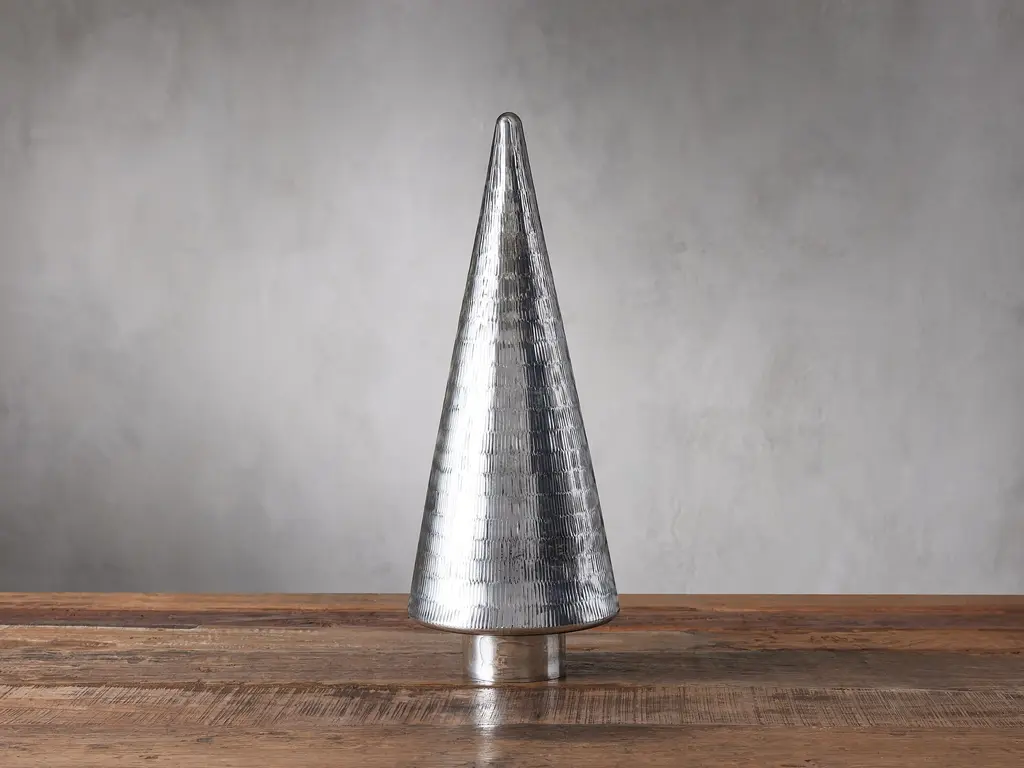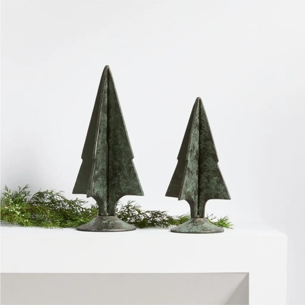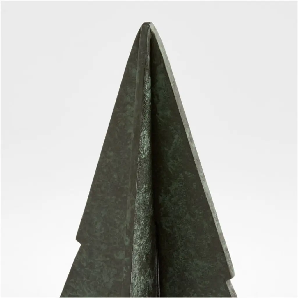 The perfect blend of modern and ancient, our verdigris tree softens clean lines with a fascinating finish. The cast aluminum panels that shape the stately evergreen recall contemporary sculptures, while the green faux patina gives it the look of a treasured antique. Cluster the large and small trees in multiples on a mantel, buffet or dining table for an elevated display that suits the winter season.