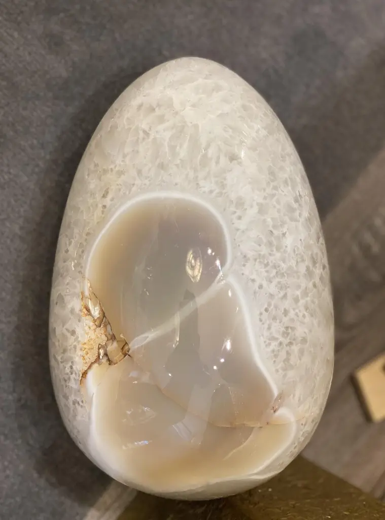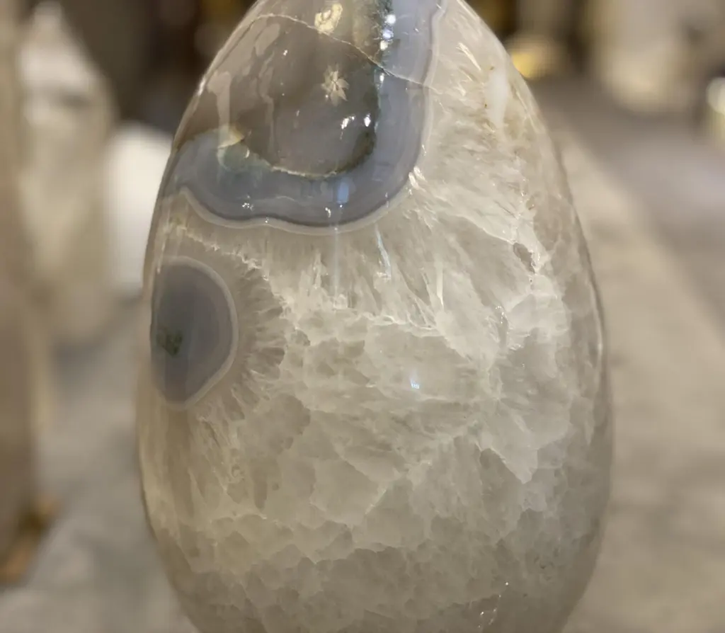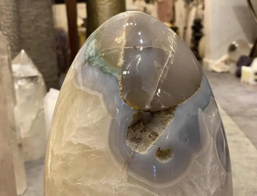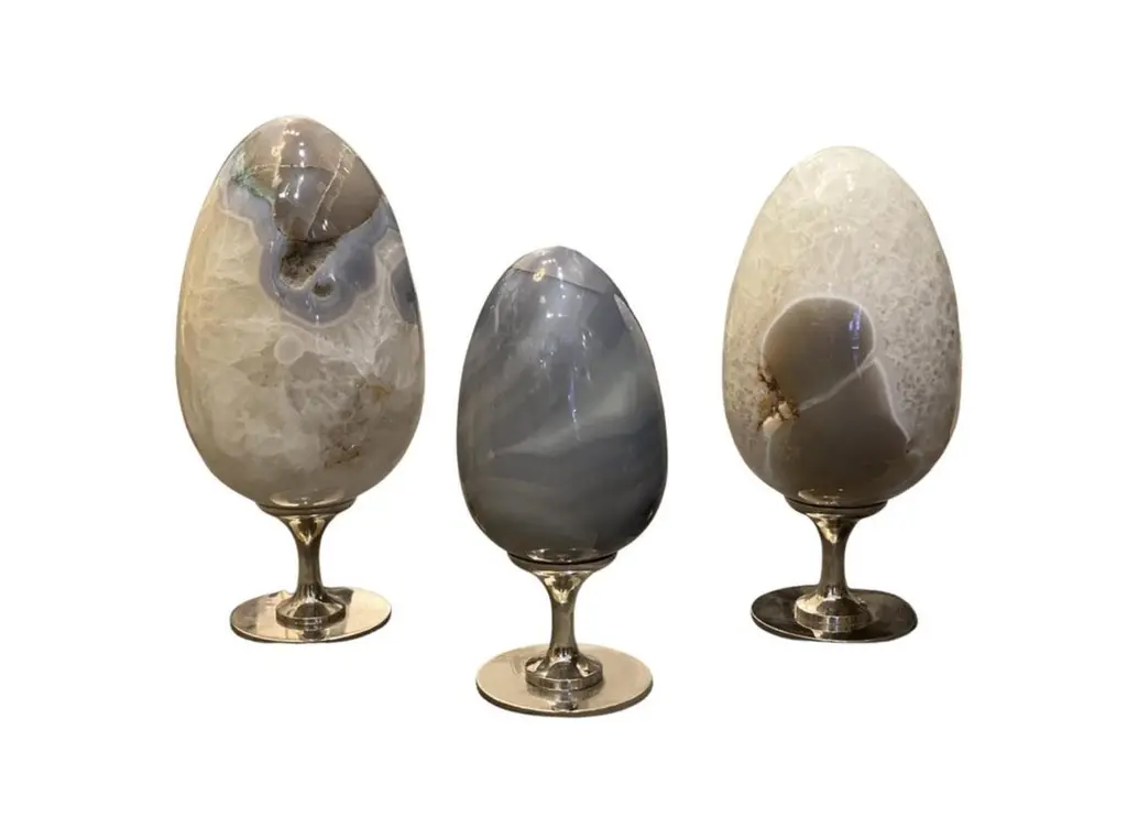 Group of three natural amazing agate sculptures on stands with beautiful colors, created by Phoenix Gallery.