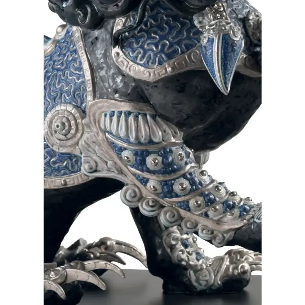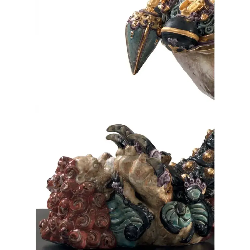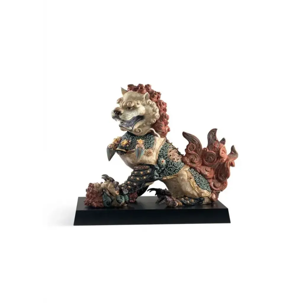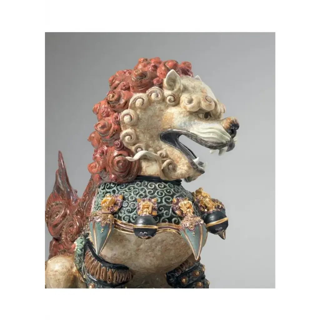 Limited edition sculpture of a guardian lioness with her cub in red and gold enamel, representing the circle of life, as the protector of Buddhist temples and palaces. An iconic Spanish brand, Lladro is a world leader in the creation of porcelain art. Started by brothers Juan, Jose and Vicente Lladro in 1953, the ceramic figurines were initially inspired by the works of great European manufacturers like Meissen and Sevres. Over time, a unique style was forged, consisting of elongated lines, a revolutionary single-firing method, and soft pastel tones.