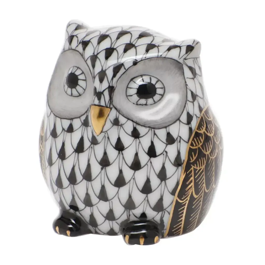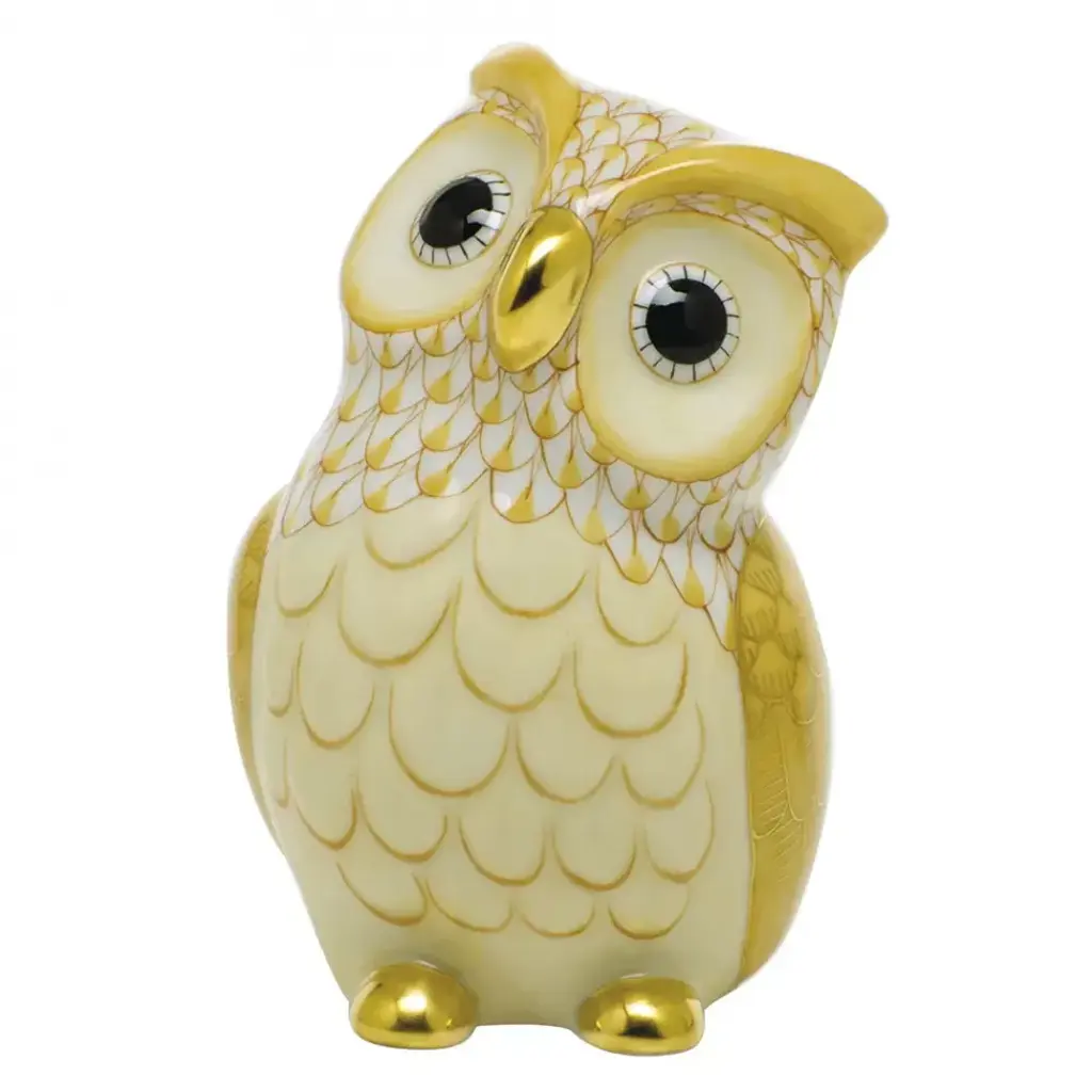 Wise and observing, this owl statuette will be an original and thoughtful housewarming gift idea thanks to its protecting and guarding symbolic features. Deftly crafted and decorated by hand by expert artisans, it is fashioned of fine porcelain lacquered in a polished petrol-green color that stunning contrasts with the dainty gold details.