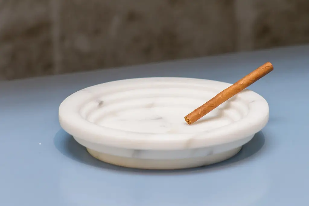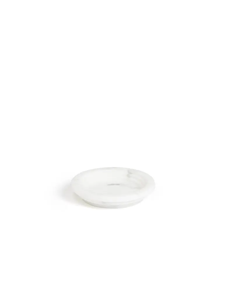 Guggenheim round ashtray by Michele ChiossiDimensions: 16 x 16 x 3 cmMaterials: Bianco Michelangelo marbleHis research is defined by the ongoing analysis of the mood that marks our daily lives, which he manifests through original still-lives and poetic reveries. He renews language by reprogramming sculpture. In fact, he revisits the shapes of his distinctive zigzag marks and rewrites the statuary through the plasticity of the modelled, using precious materials (specifically marble) and technological ones (neon, urethane rubber, epoxy resins), often combining them.