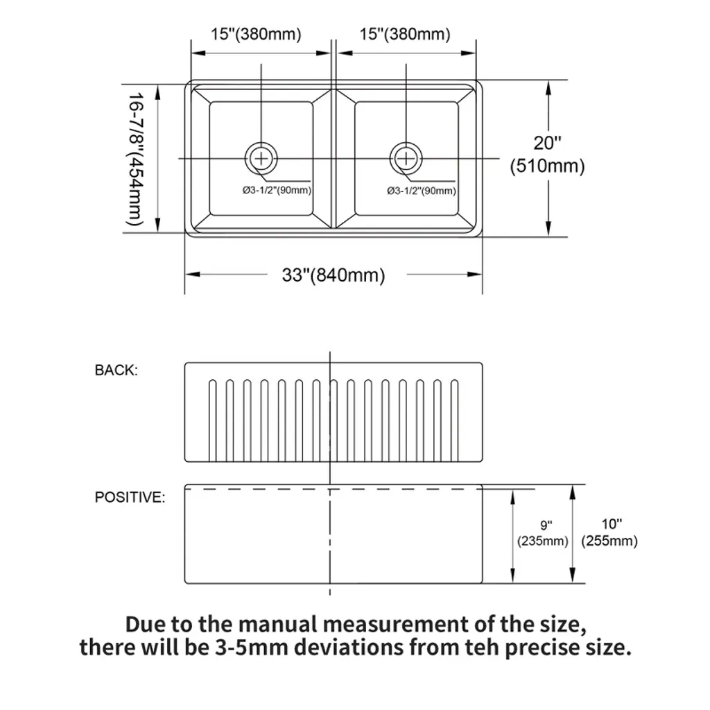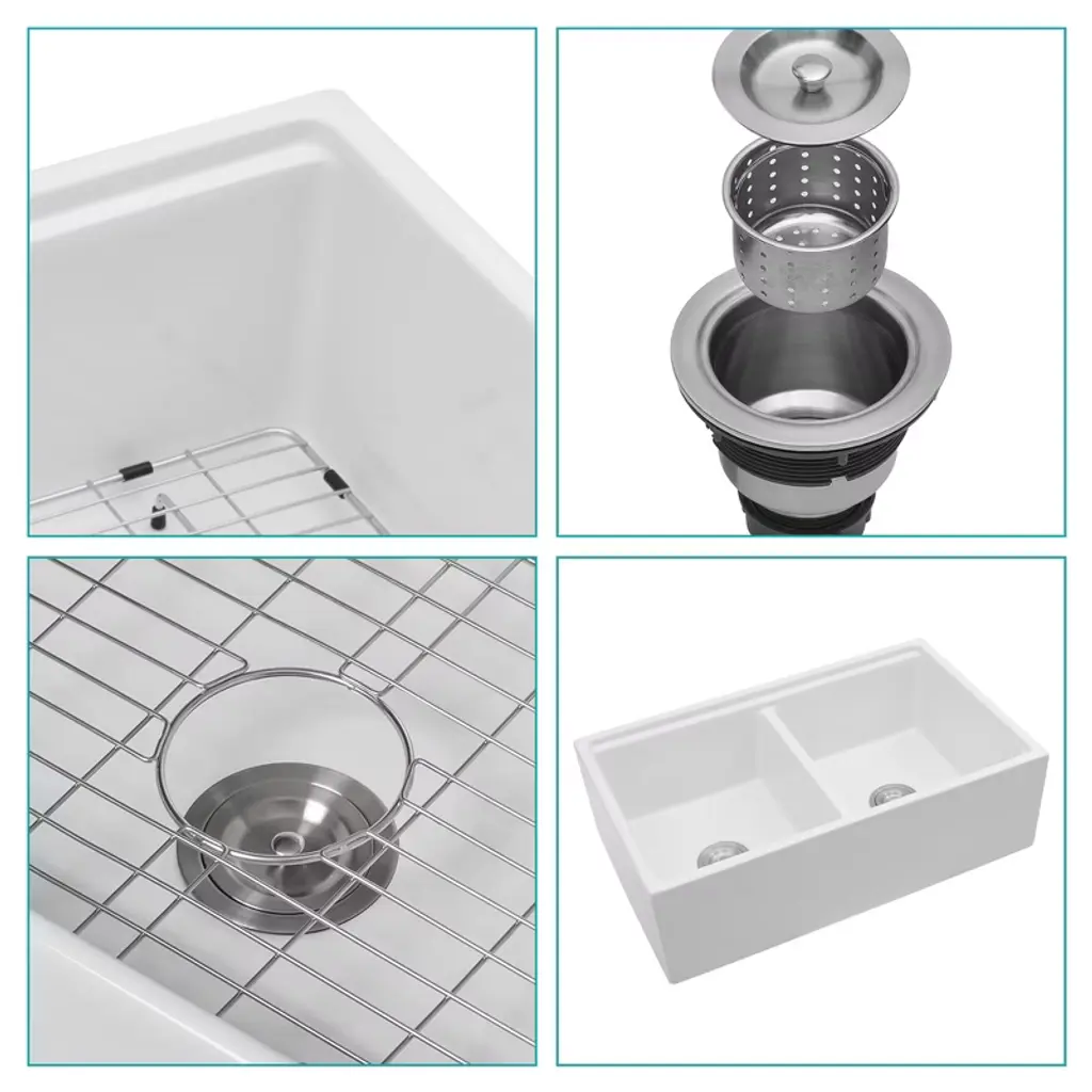 Gulches 33" white ceramic double bowl farmhouse sink blends durability and functionality. Crafted from robust ceramic, it resists chips, scratches, and discoloration. Built-in ledges create a flexible workstation, saving space. Easy to clean with soapy water, stain-resistant. Deep 10" basin fits large cookware. Includes accessories and installation guide.