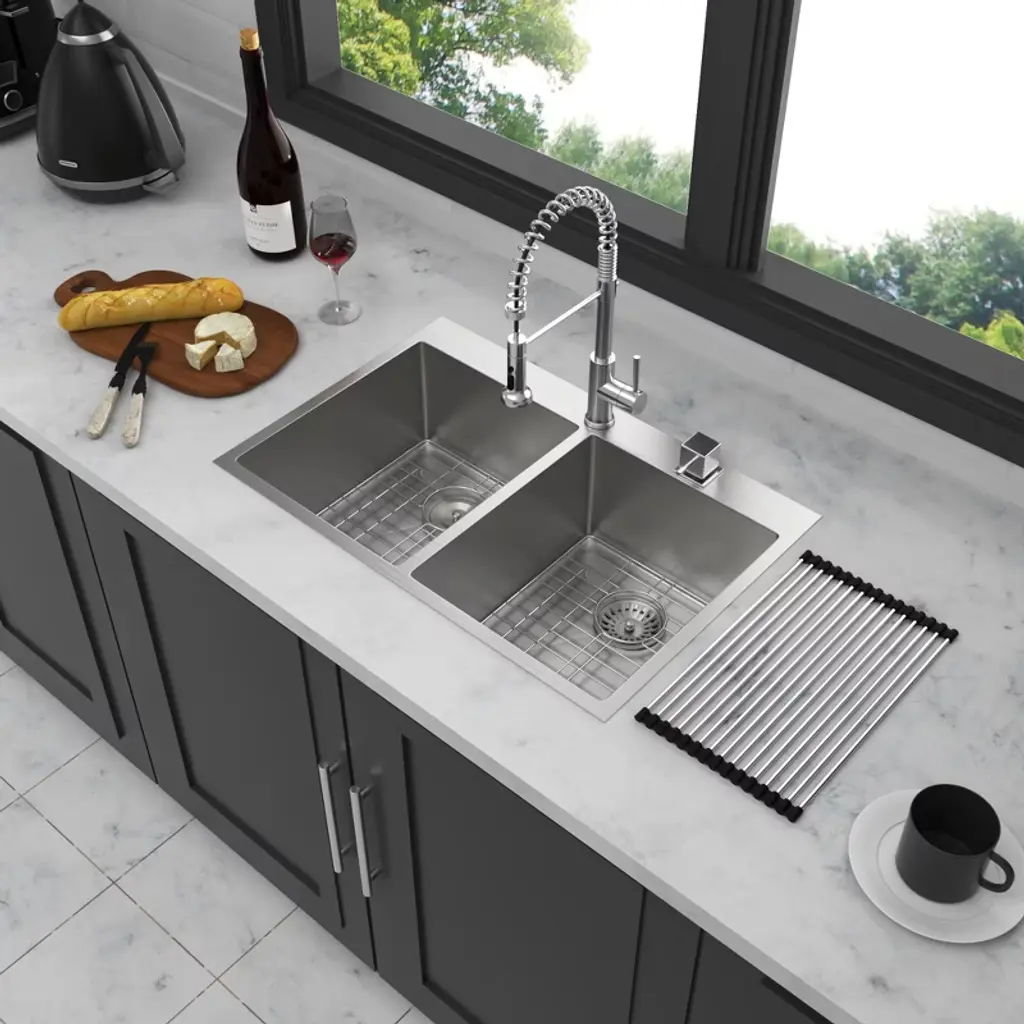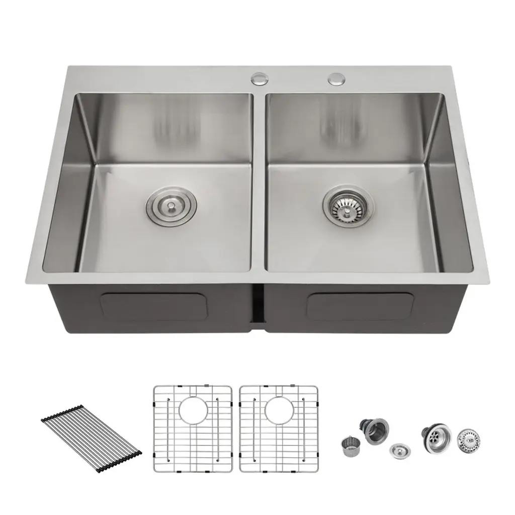 Gulches Modern Farmhouse 50/50 Double Bowl Drop-in Sink, 16g T304 Stainless Steel, 33"x22"x10"