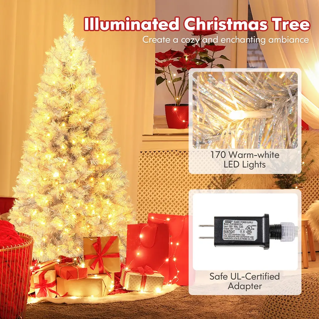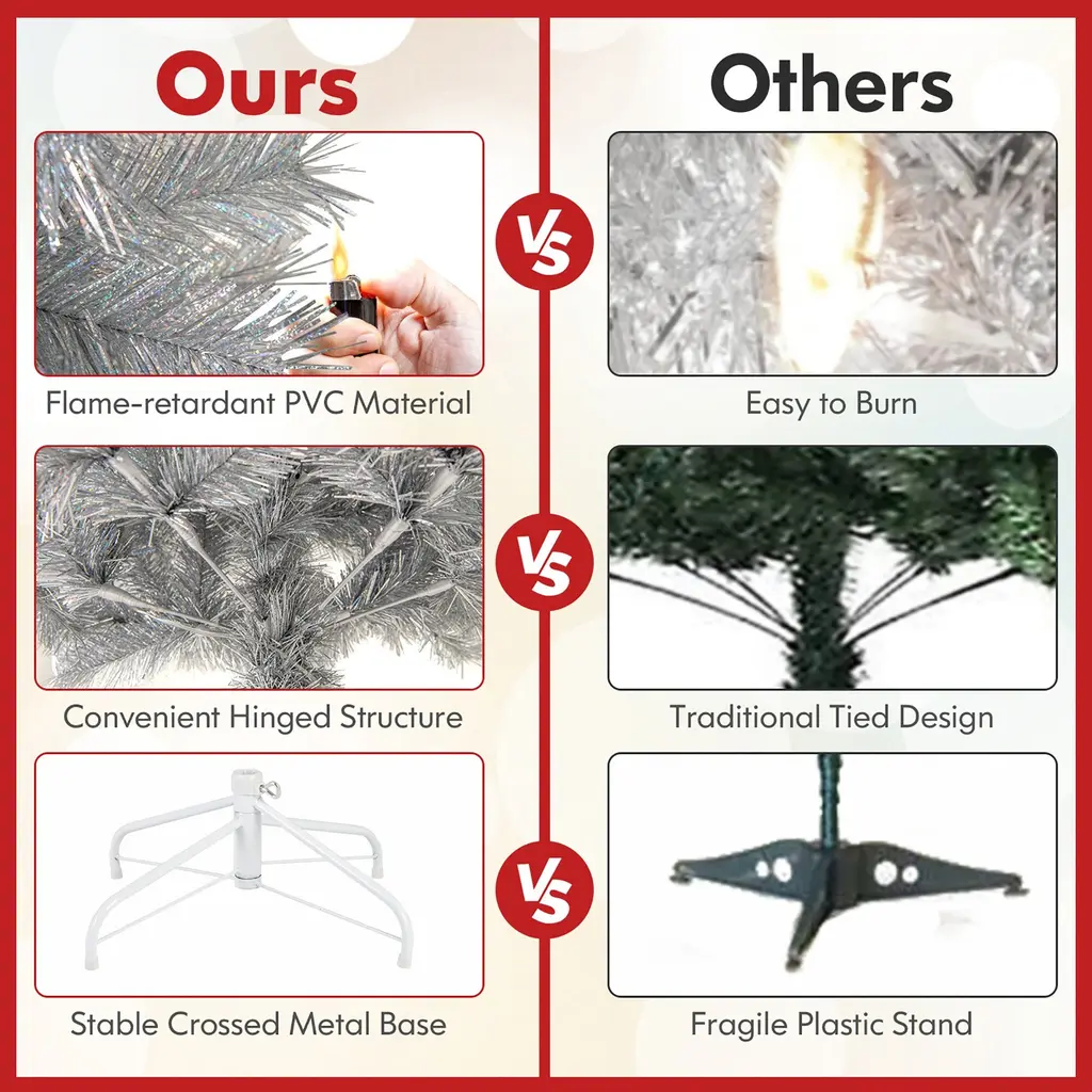Create a Captivating Holiday Display! Our 5/6/7 ft pre-lit artificial Christmas tree is adorned with charming silver tinsel leaves, which could beautifully reflect different colors in different lights and angles, bringing a touch of elegance and modernity to your festive decorations. Moreover, it is illuminated with warm white lights, adding a cozy and inviting ambiance. Setting up this tree is a breeze with its 2/3/3-section design and convenient hinged structures that allow branches to automatically spread out, complete with a pre-assembled screw on the foldable base for effortless fixation. Additionally, our tree is crafted from 100% new PVC leaves, supported by a robust crossed metal base, ensuring safe and long-lasting use.Features:Comes with 385/553/807 lush leaves, create a full-bodied appearance Adopts silver tinsel leaves, add a touch of sophistication and elegance The silver leaves would reflect colorful lights for a magical displayColor: Silver Material: PVC, Metal Tree Height: 5 ft/150 cm, 6 ft/180 cm, 7 ft/210 cm Tree Width: 2.6 ft/80 cm, 3.1 ft/96 cm, 3.6 ft/110 cm Diameter of Stand: 16''/40 cm, 18''/45 cm, 22''/55 cm Number of Branch Tips: 385/553/807 Number of LED Lights: 170/230/400 Number of Sections: 2/3/3 Net Weight: 9.5 lbs/4.5 kg, 12 lbs/5.5 kg, 20 lbs/9 kg Package Includes: 1 x Christmas Tree 1 x User Guide