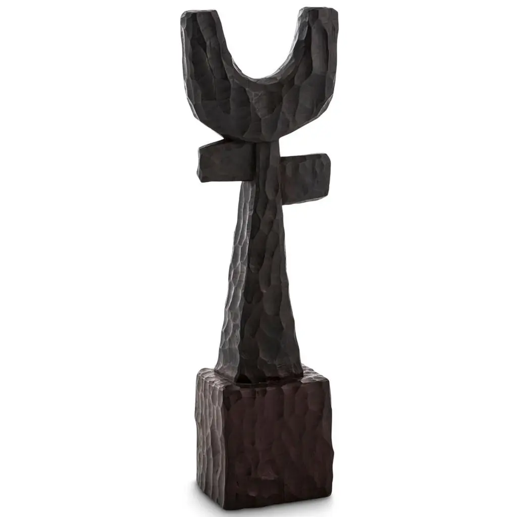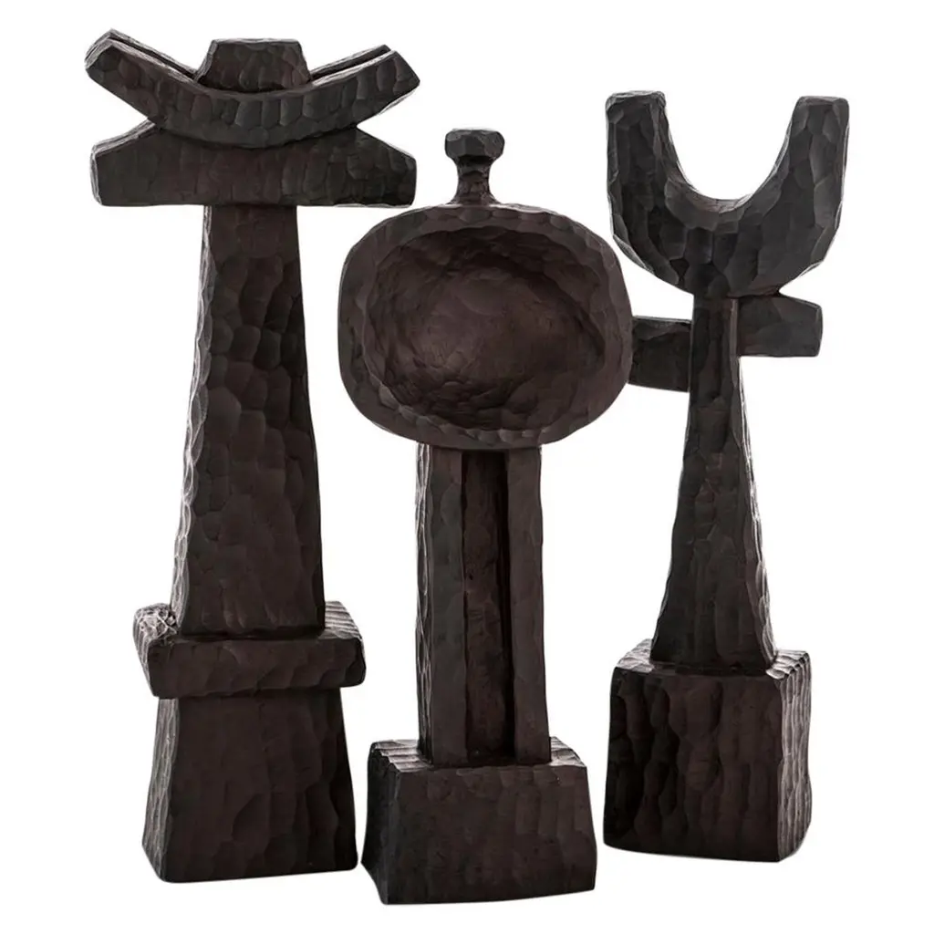 The Khada Totem Sculpture #2 is hand-carved in Southern Africa from sustainable alien timber by a collective of Zimbabwean artisans, who set their own prices, ensuring each piece is fair trade. These sculptural forms evoke a primal, brutalist energy with strong African modernist undertones. Each totem’s surface is deeply textured by hand, with variations that highlight the artistry of the maker. Designed as decorative objects, they can stand alone or be grouped as a set of three for impact. These collectible sculptures make striking additions to mantels, desks, or coffee tables. While similar in form and scale, no two are identical, offering a truly unique art object. Sizes vary; the largest sculpture measures approximately 60cm high. Please enquire for current availability.