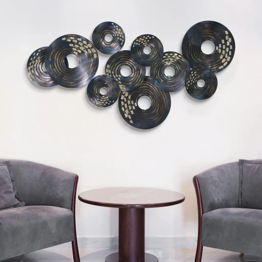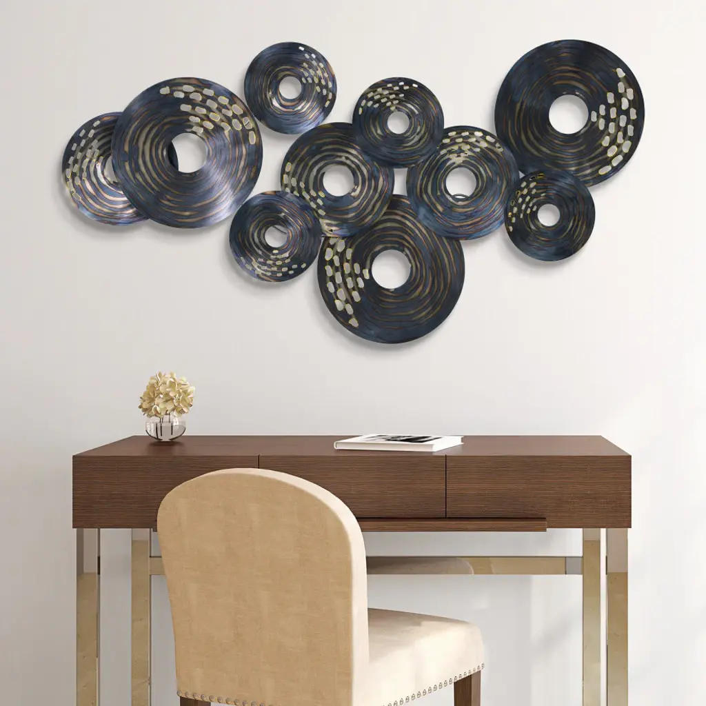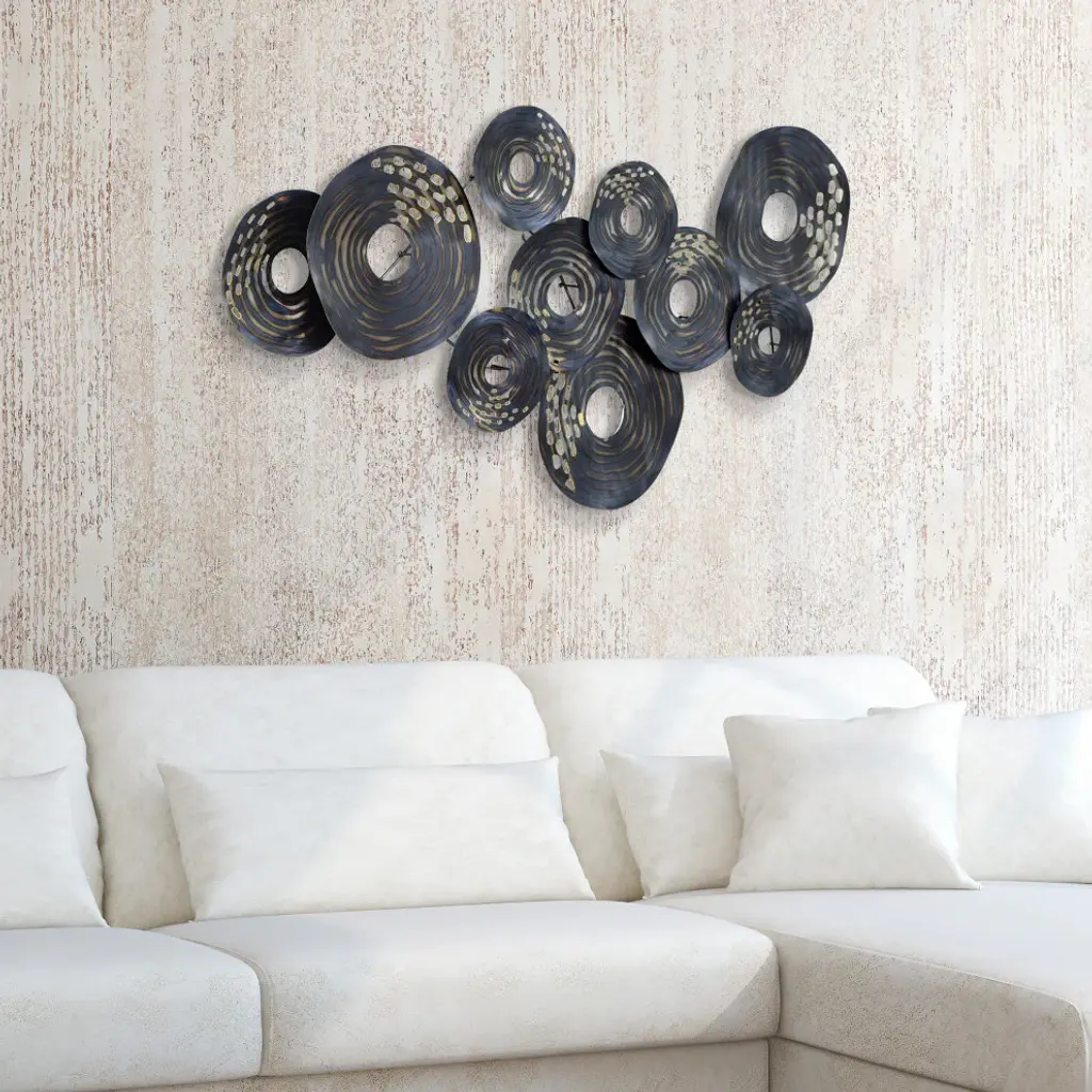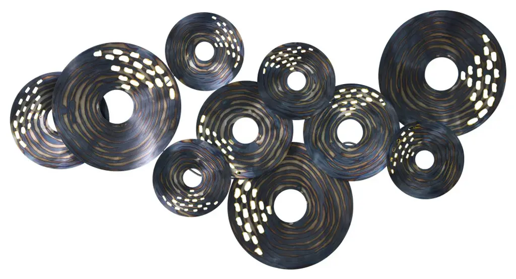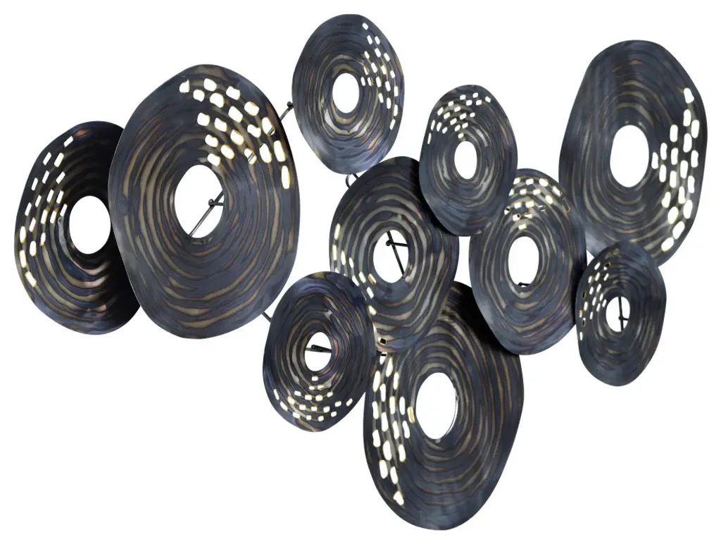 This unusual piece combines blueish greys and hints of gold to create a swirling maelstrom in each circle, highlighted with white speckles. The pattern creates the impression of each disc spinning, a very striking design that should add a touch of dynamism to any room. The colours seem to invoke molten lava, as if these discs were not moulded from metal sculpture but were instead some natural wonder hewn by the earth"™s power.