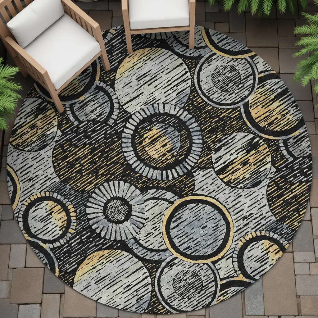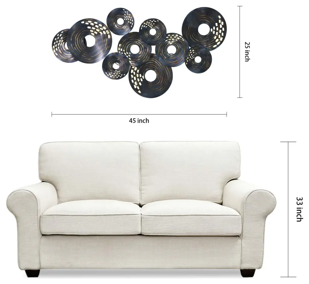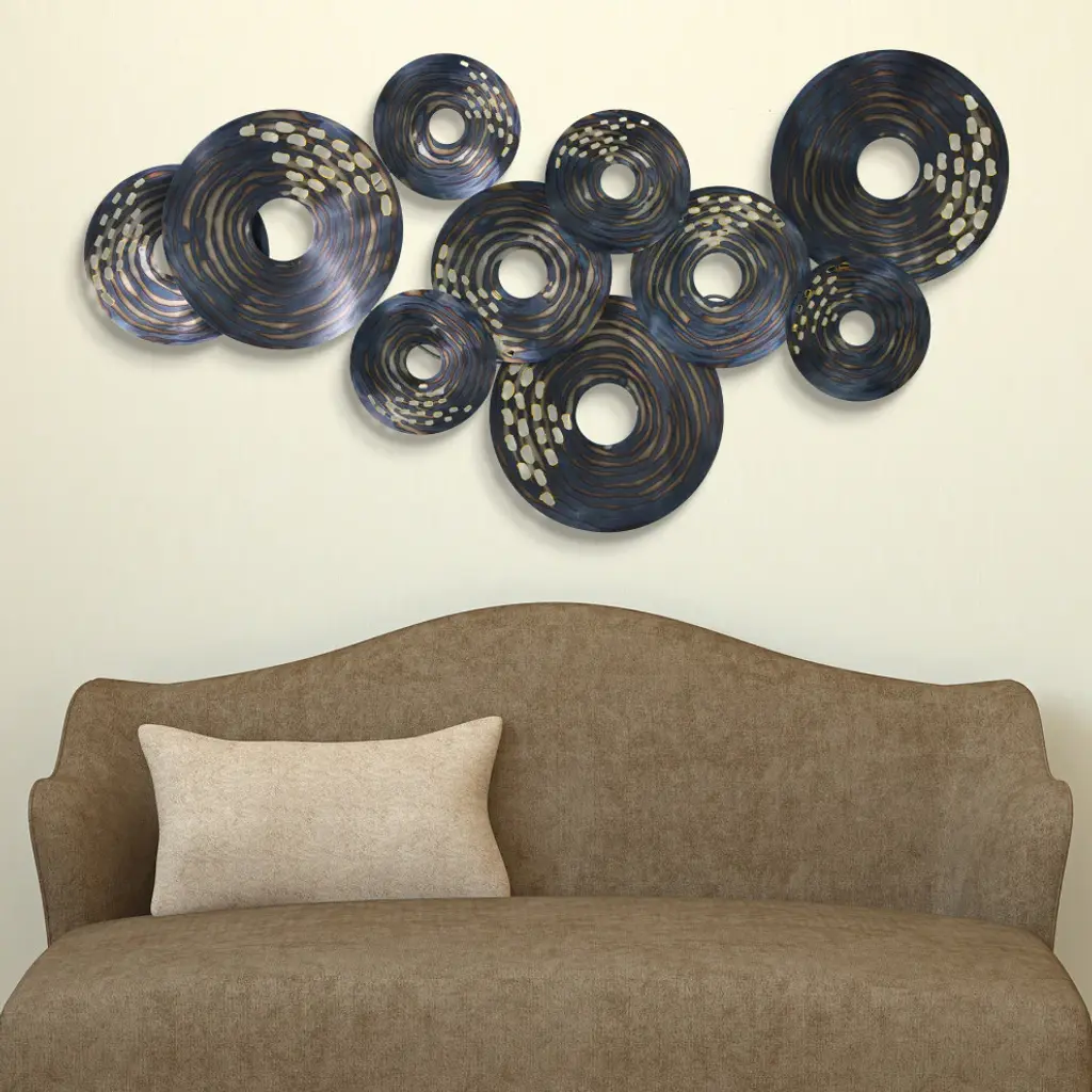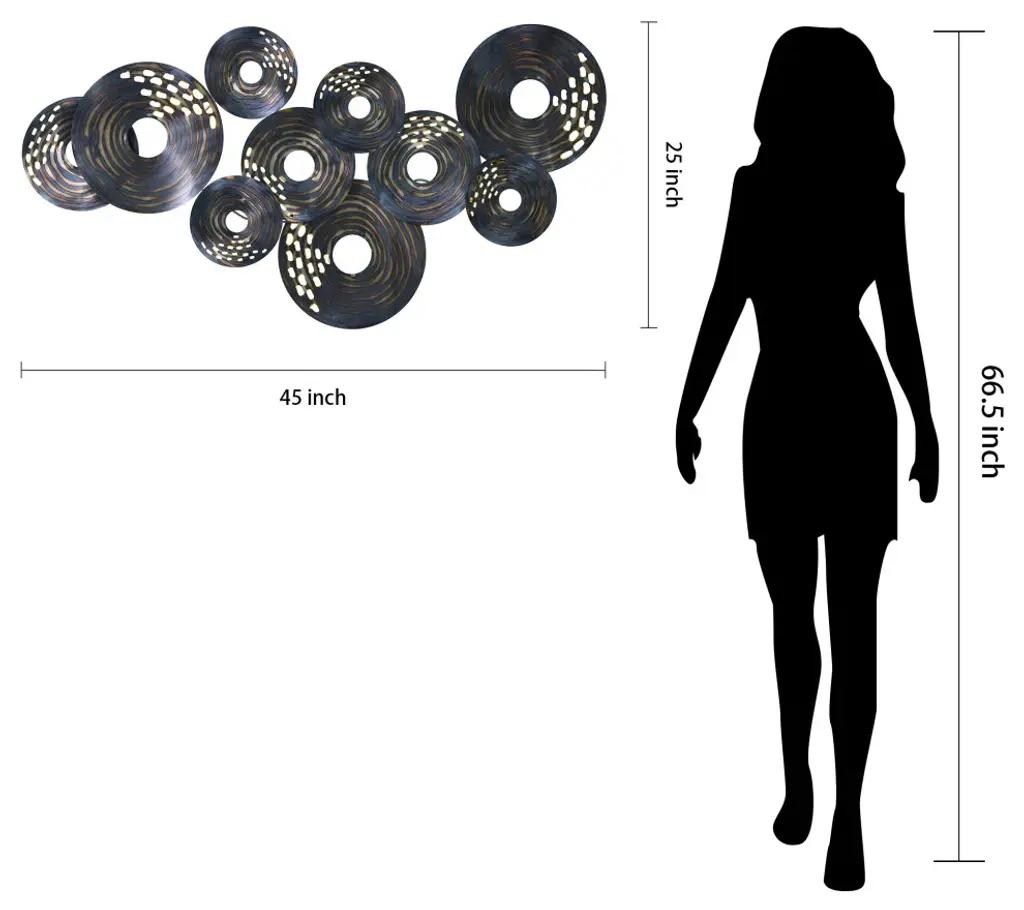 This unusual piece combines blueish greys and hints of gold to create a swirling maelstrom in each circle, highlighted with white speckles. The pattern creates the impression of each disc spinning, a very striking design that should add a touch of dynamism to any room. The colours seem to invoke molten lava, as if these discs were not moulded from metal sculpture but were instead some natural wonder hewn by the earth"™s power.