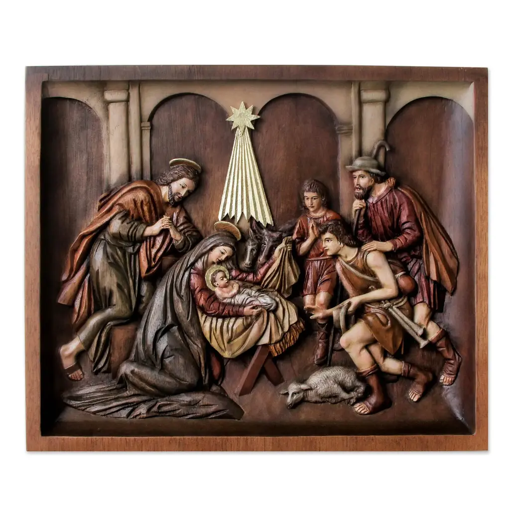 Expertly carving cedar wood, Javier Ramírez depicts the first Christmas in a classic composition. Mary and Joseph gaze at little Jesus and shepherds fall to their knees in worship. Ramírez adds subtle color by hand and applies bronze leaf to the halos and the shining star. A hook at the back facilitates wall display.