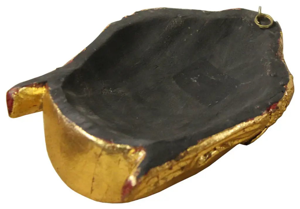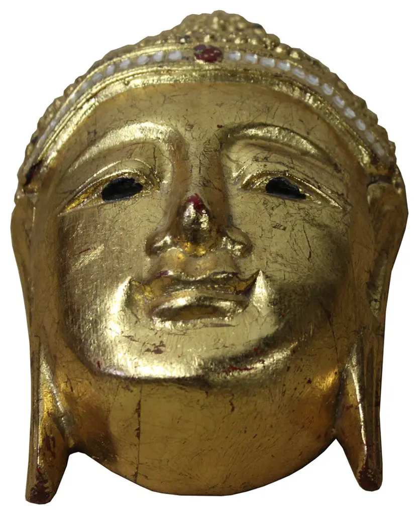 Handcrafted wood sculpture Buddha face painted with gold color. This Buddha face is great for living room table top and wall display. Serene peaceful meditate posture is a great reminding of our daily life and good Feng Shui for house and office.Dimension: w5.25" x d3.25" x h8.25"Origin: ChinaMaterial: Wood & Gold leaf paintWork: Handcrafted
