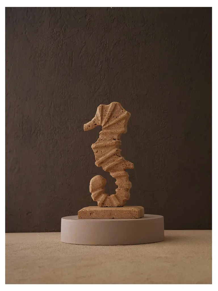 Handmade Seahorse Travertine Sculpture, Terracotta