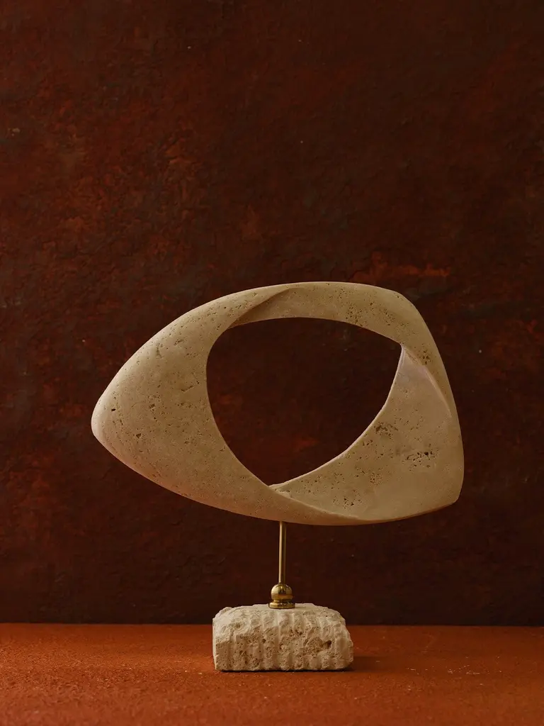 The Travertine Abstract Sculpture is a modern exploration of form and void—designed to bring elegance, movement, and balance into interior spaces. Hand-carved from natural beige travertine, this medium-sized piece features a dynamic hollow shape, reminiscent of a wind-carved stone or a minimalist eye. Mounted on a textured travertine base with a brass accent rod, it stands with quiet sophistication. Whether displayed alone or as part of a sculptural grouping, it adds architectural interest and a calming, organic energy to consoles, shelves, or curated surfaces.